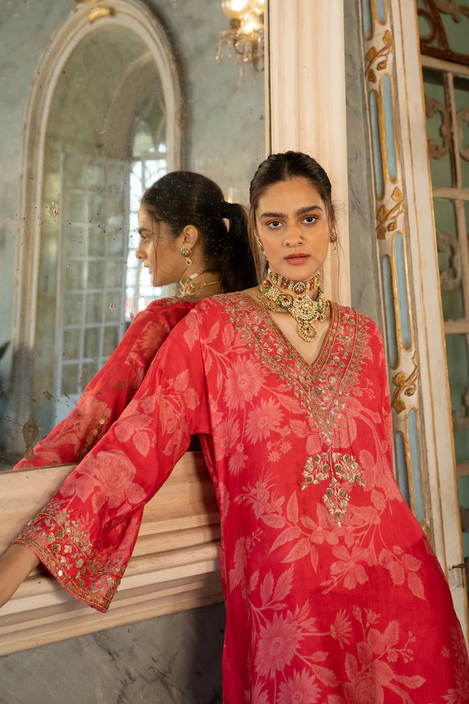 Featuring a red floral printed kurta set paired with cotton silk pants with antique gold embellished hand work.