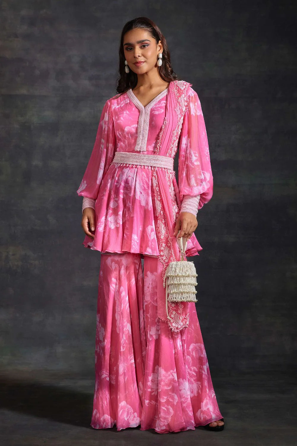 Kurta- Front fastening printed kurta, blouson full sleeves, backless with drawstring, v neck, cuff with zipper, sharara- divided sharara, front belted back elasticated, dupatta- crinkle chiffon embroidered dupatta, belt- drawstring embroidered belt.