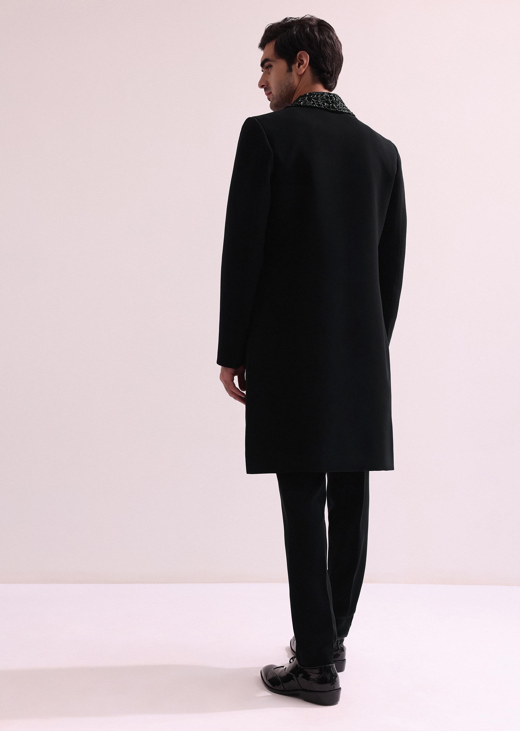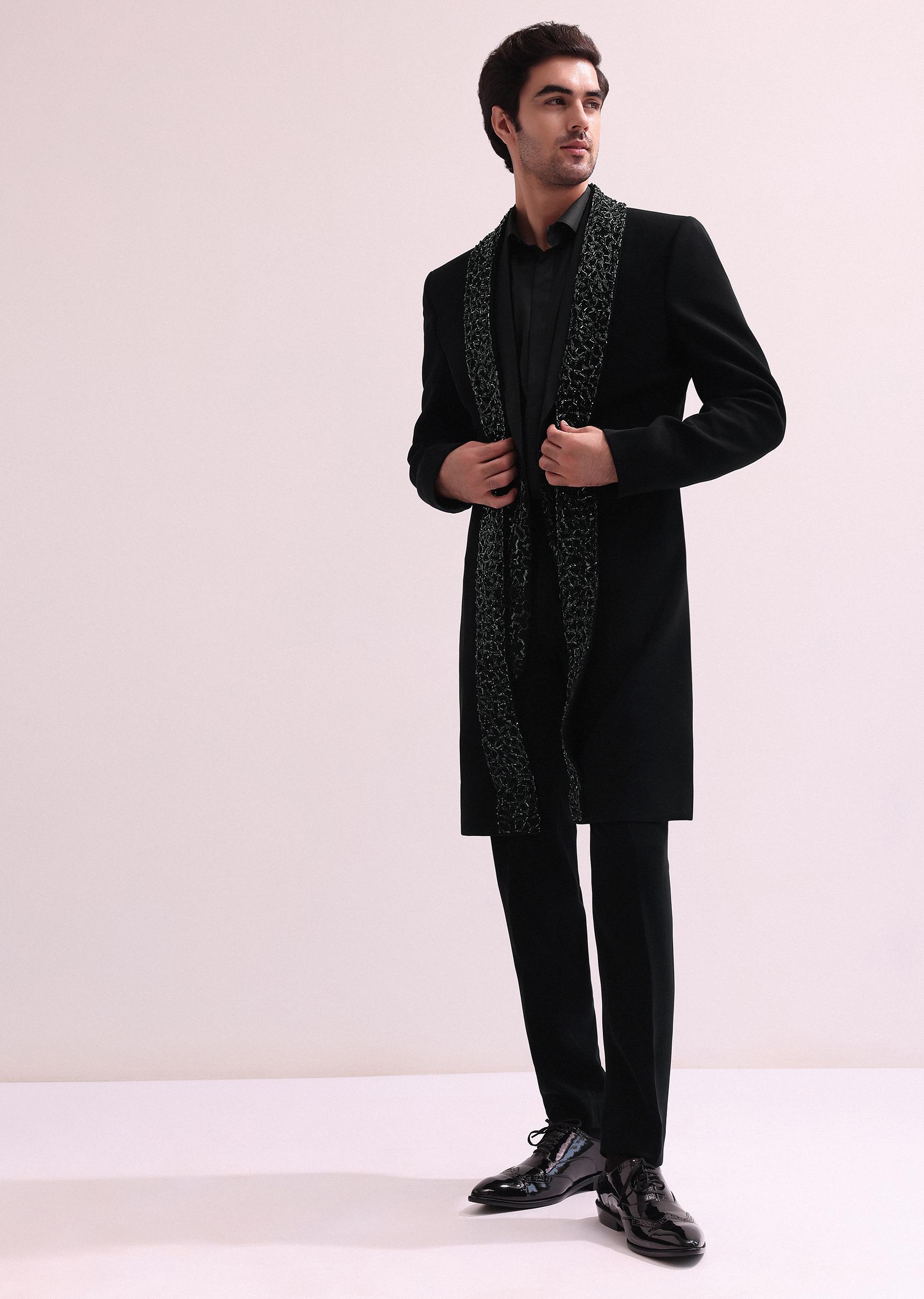 - Striking tones and luxurious textures come together in ino-western ensemble. Featuring a hand embellished double layered jacket with lapel detailing and glistening hand embellished cutdana accents. Fabricated from luxurious suiting.