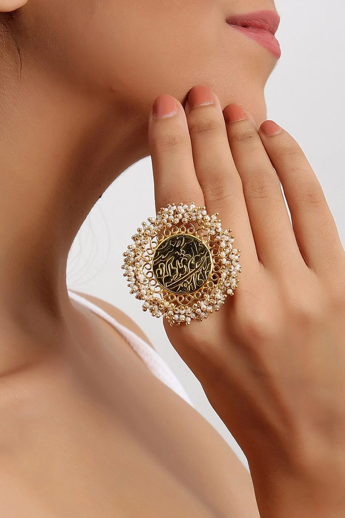 - A Statement Ginni Coin Ring handcrafted with fine filigree work needled with cream seed pearls and dipped in 22k gold