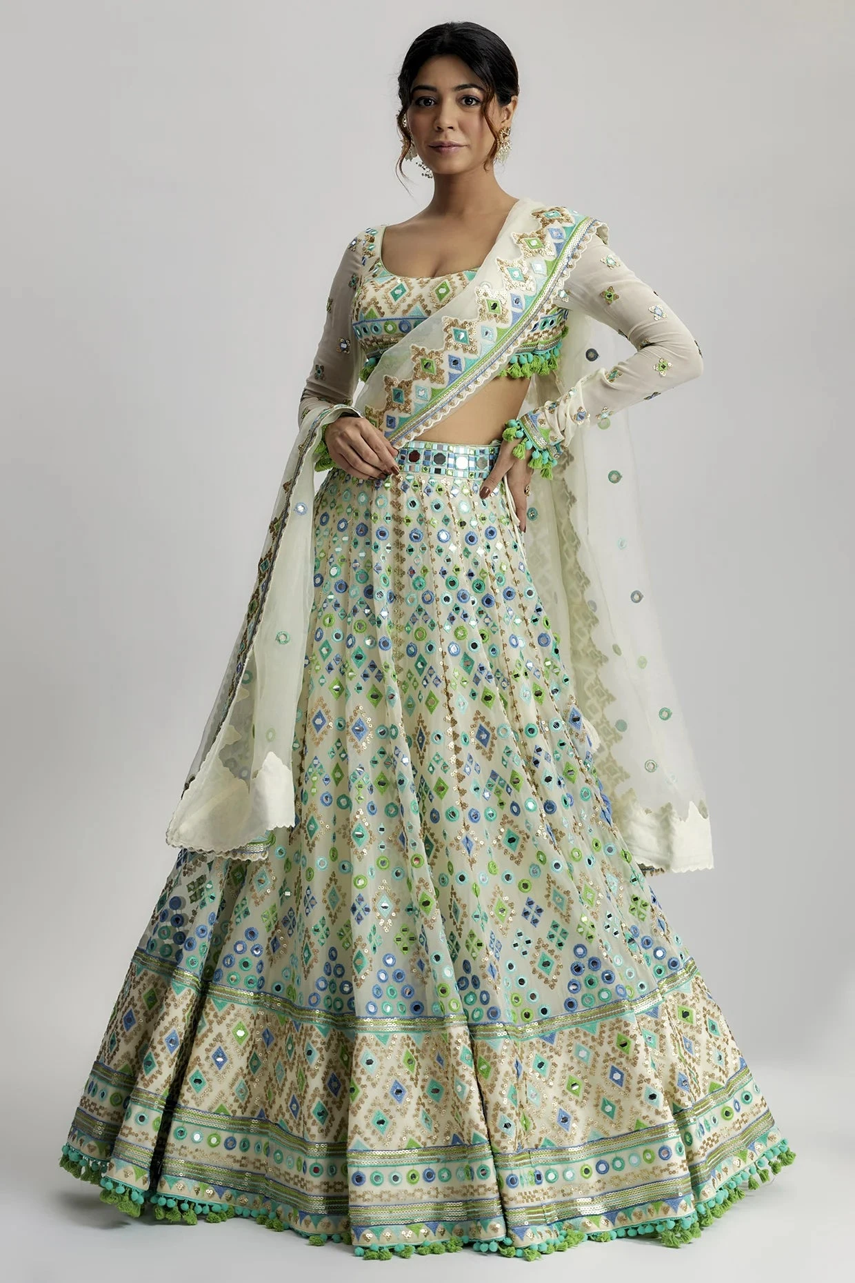 The Detailed Hand And Machine Embroidery On The Alani Lehenga Set Further Elevates Its Beauty. Skilled Artisans Have Intricately Adorned The Blouse, Skirt, And Dupatta With Exquisite Embroidery Patterns, Using A Combination Of Fine Threads And Sequins. The Embroidery Work Adds Depth And Dimension To The Ensemble, Making It A True Work Of Art.