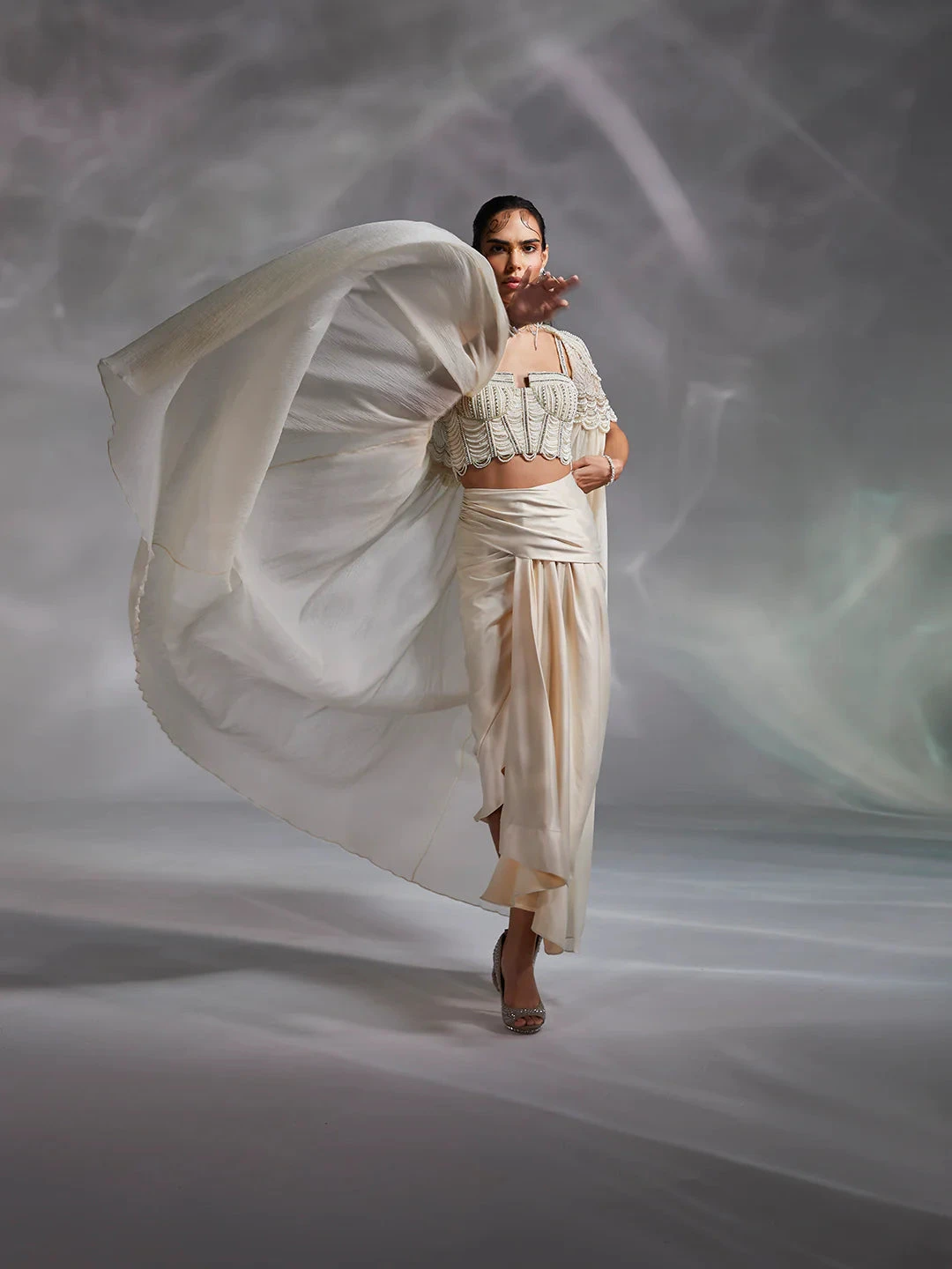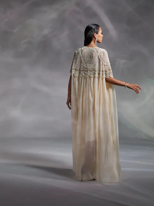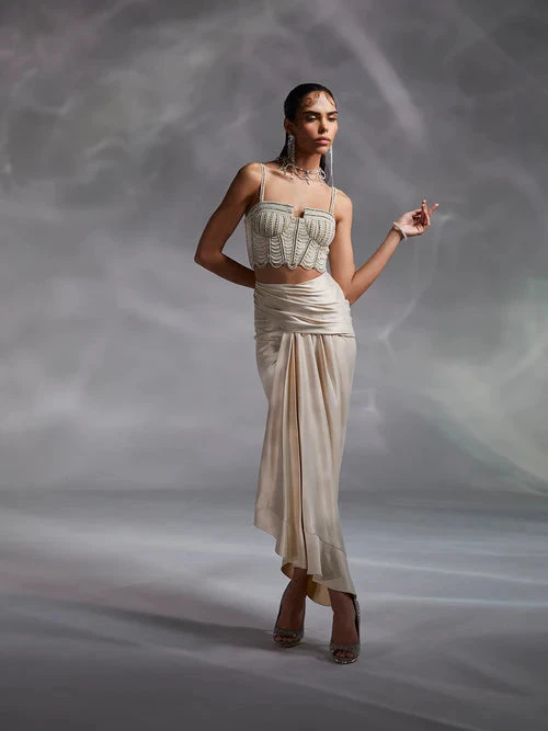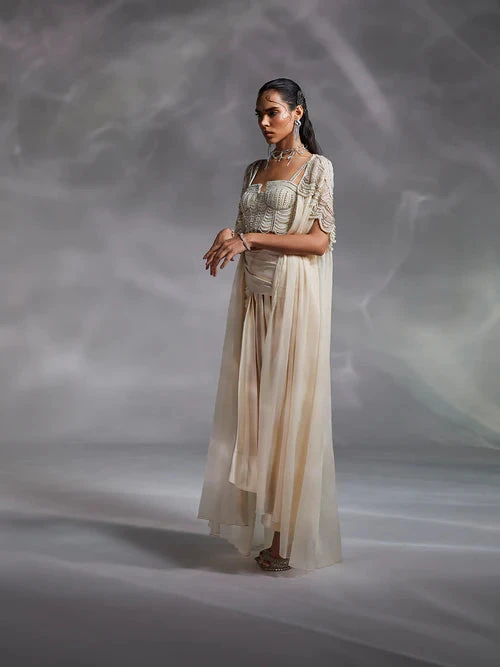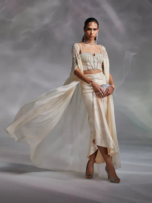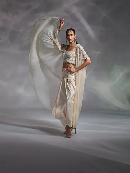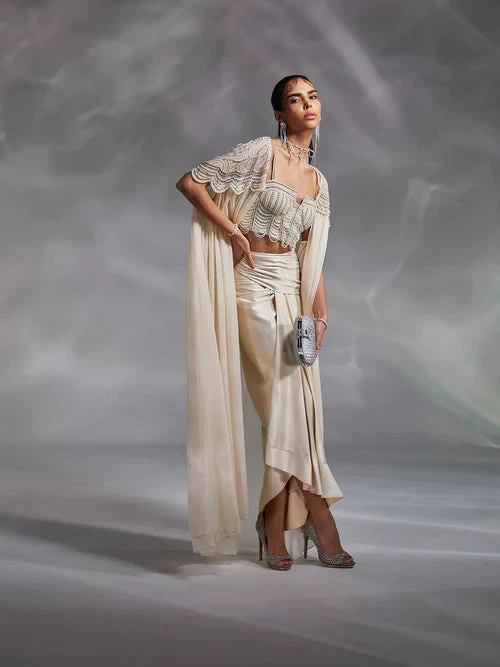 Hand embellished by master artisans, Alauren set features a corset-inspired blouse with silky satin draped skirt. The cape’s shoulder work and sensorial appeal of the set make a distinctive statement.
