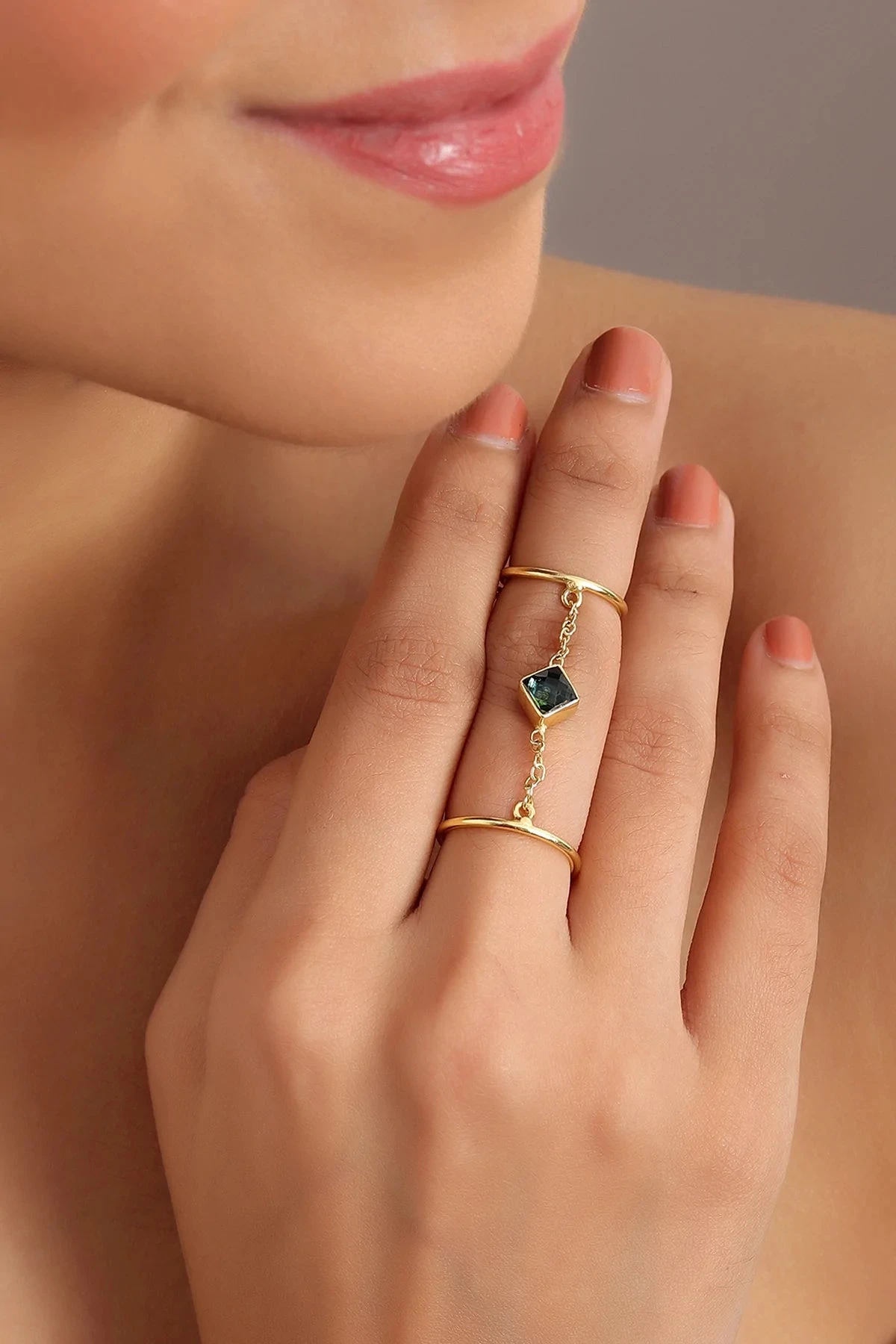 - Long Finger Ring encrusted with semiprecious London Blue Topaz quartz dipped in 22k gold