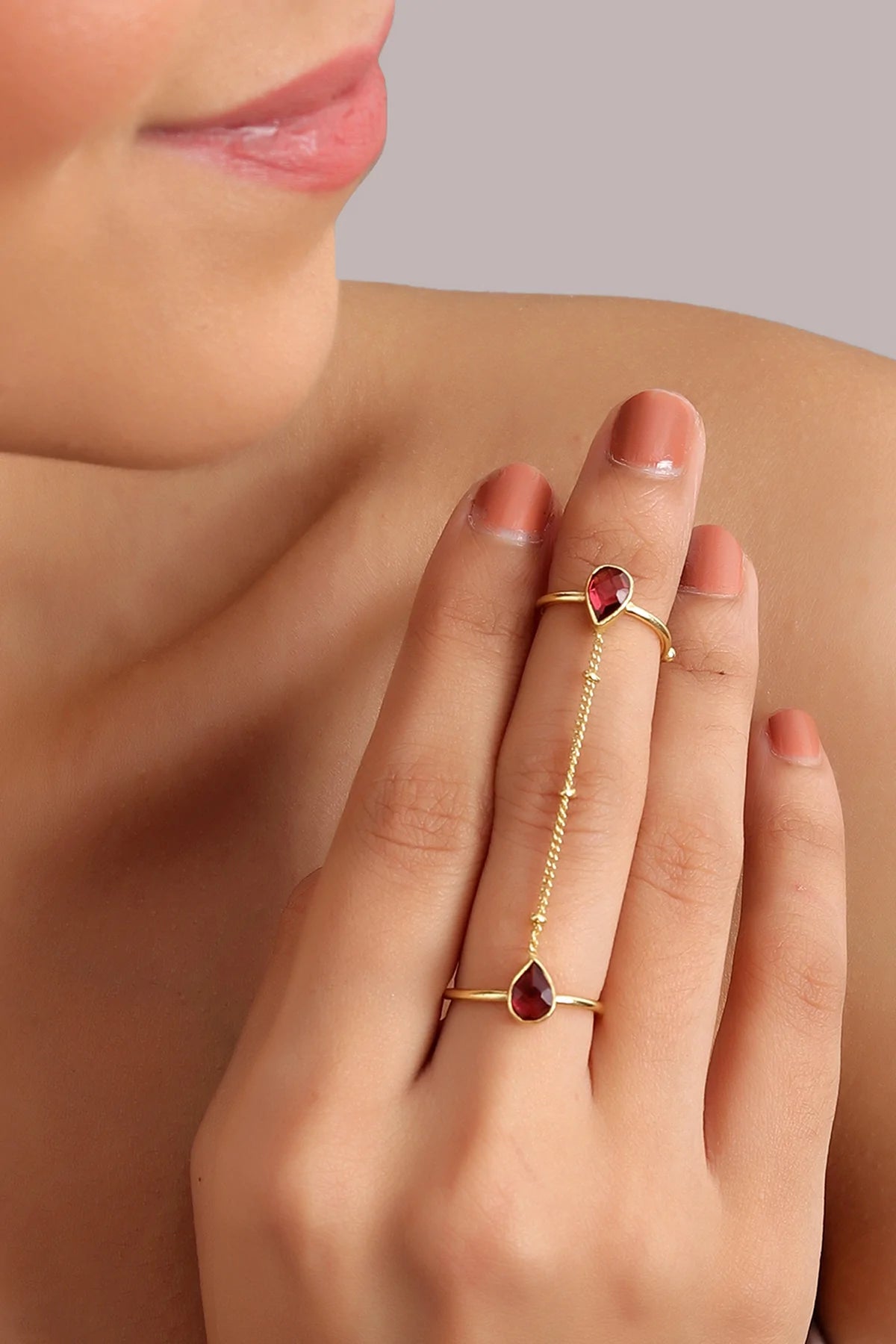 - Long Finger Ring encrusted with pink and ruby quartz dipped in 22k gold