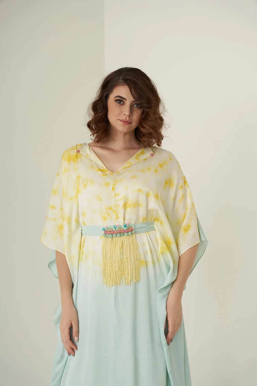 Tie And Dye Ombre Kaftan Comes With Detachable Fringe Belt.