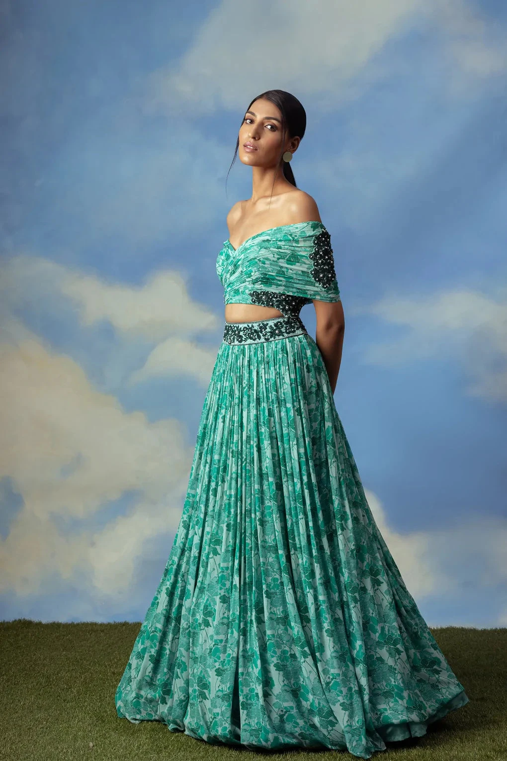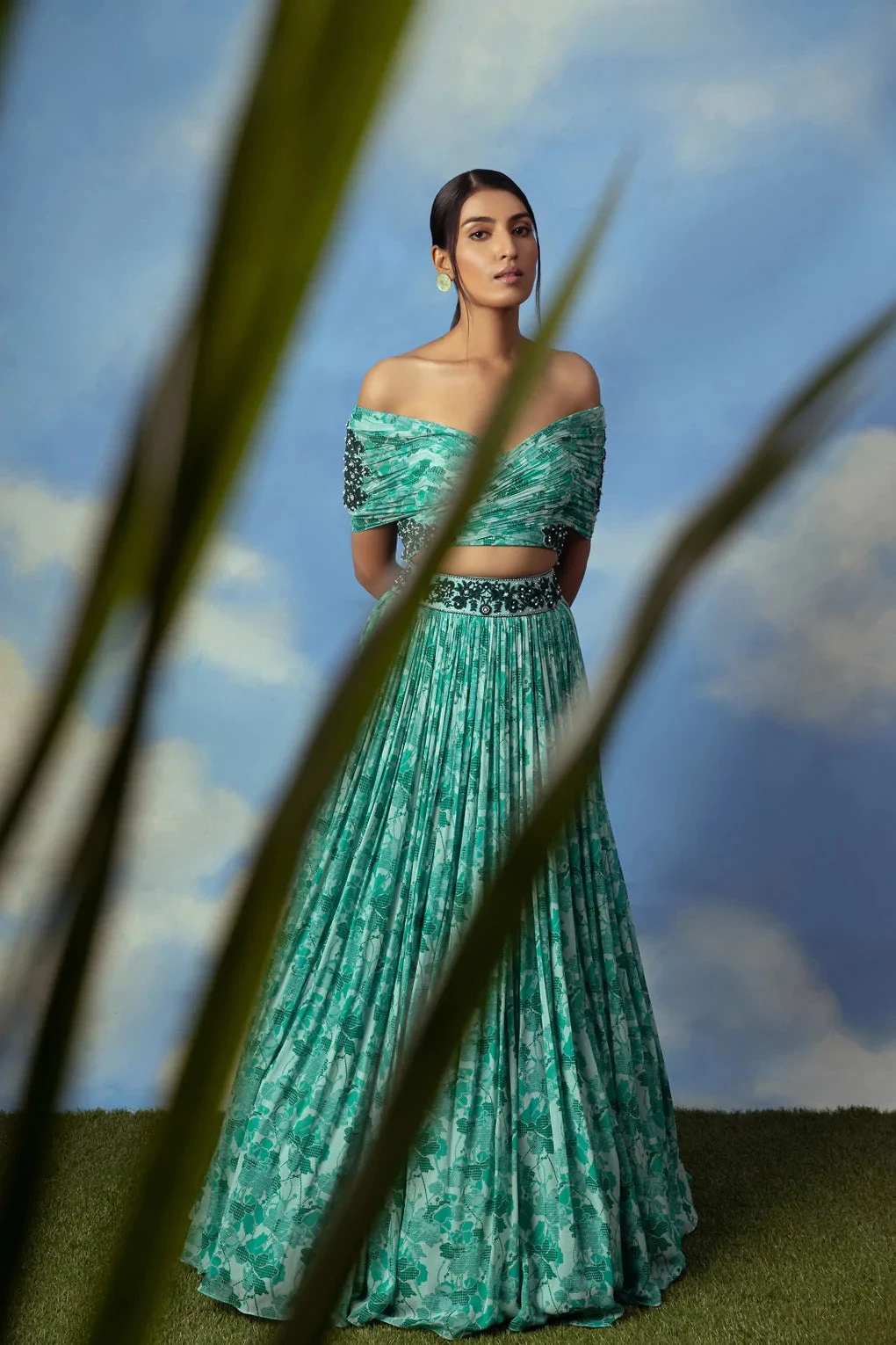 Aqua green printed Crop top skirt with embroidered blouse. The blouse is an off-shoulder style, made with a georgette rooshing technique embroidered with thread and pearls on the waistline and sleeve, with a back opening. The skirt is made with georgette with layers of lining and can. The waist belt of the skirt is embroidered with thread and pearls. The skirt has a side zipper.