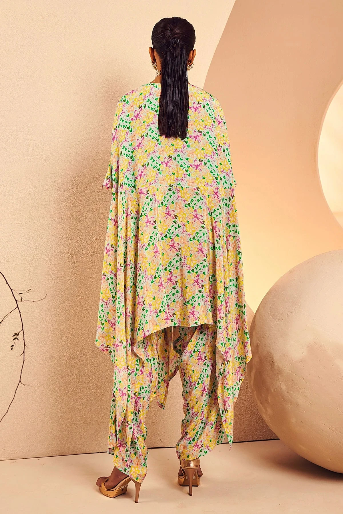 Featuring an abstract floral printed poncho styled kurta with a dhoti salwar . The neckline is embellished fully by hand with intricate coloured cutdana and beads. It is also accentuated with drop stones