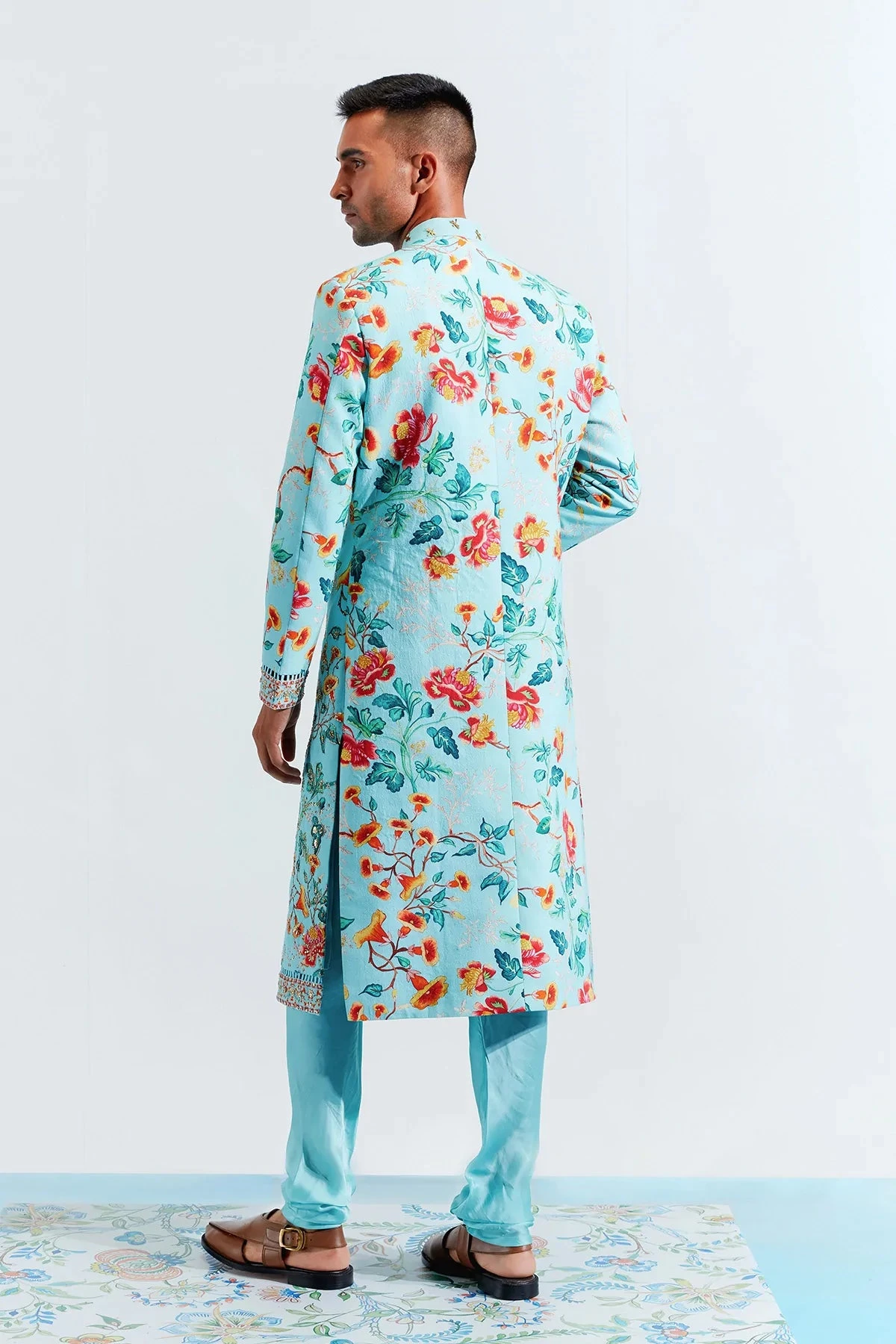 Blue textured cotton embroidered sherwani, satin organza kurta and churidaar set