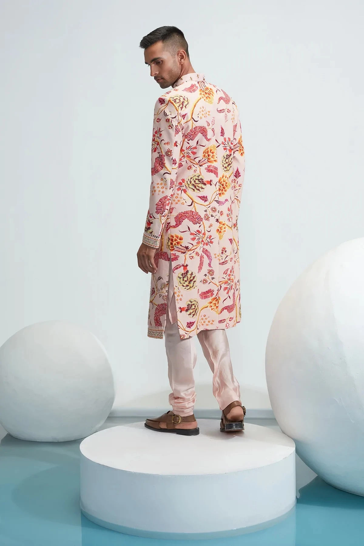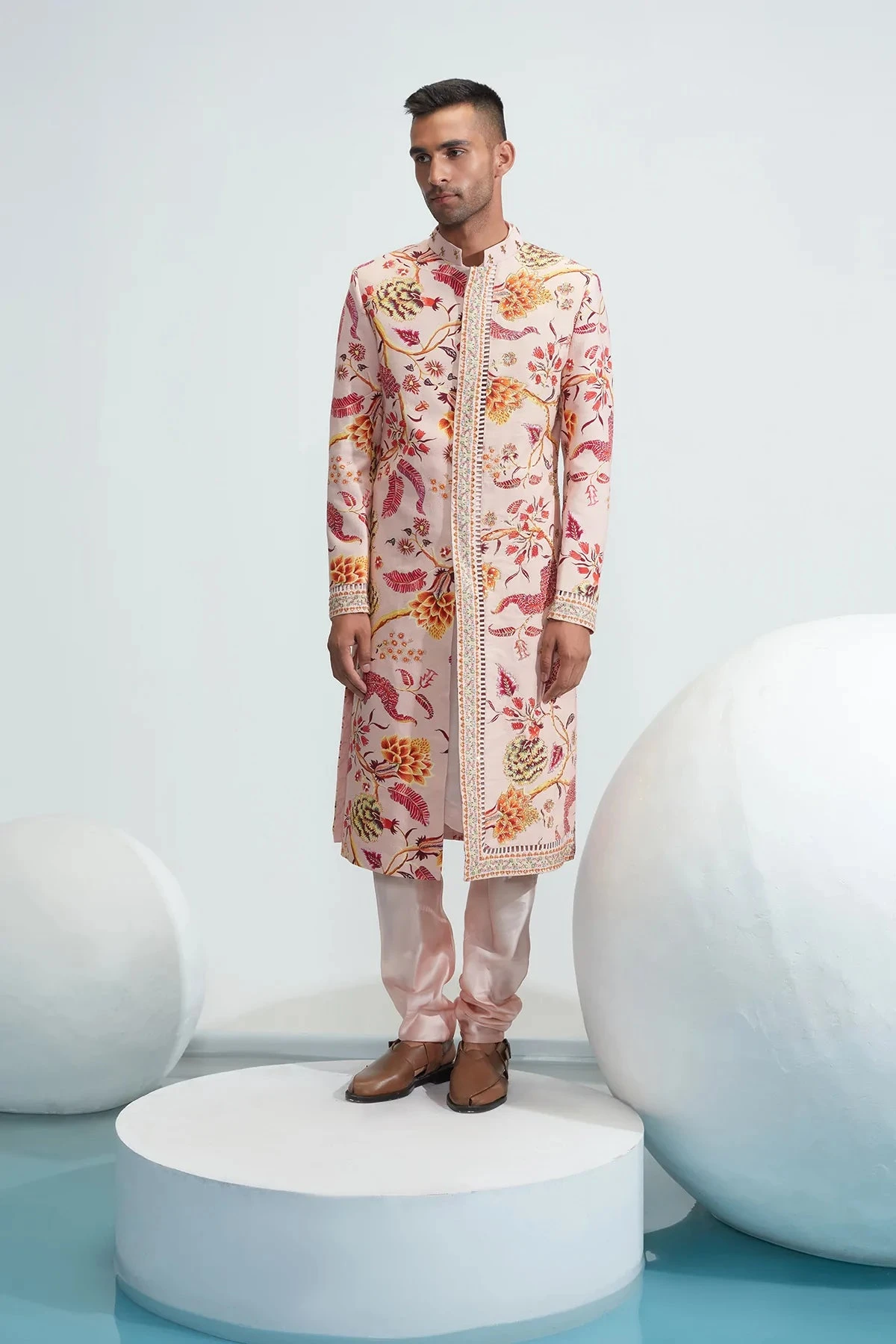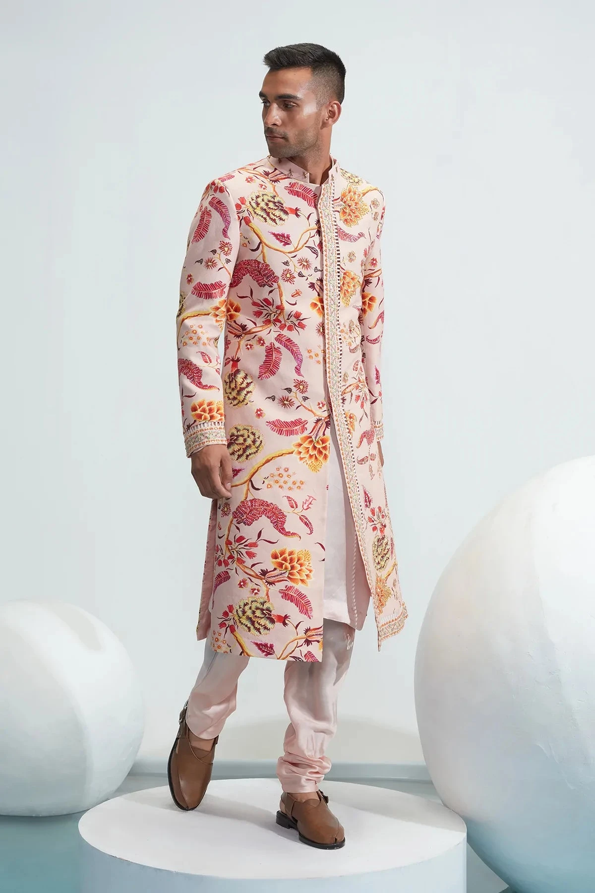 Nude textured cotton embroidered sherwani, satin organza kurta and churidaar set