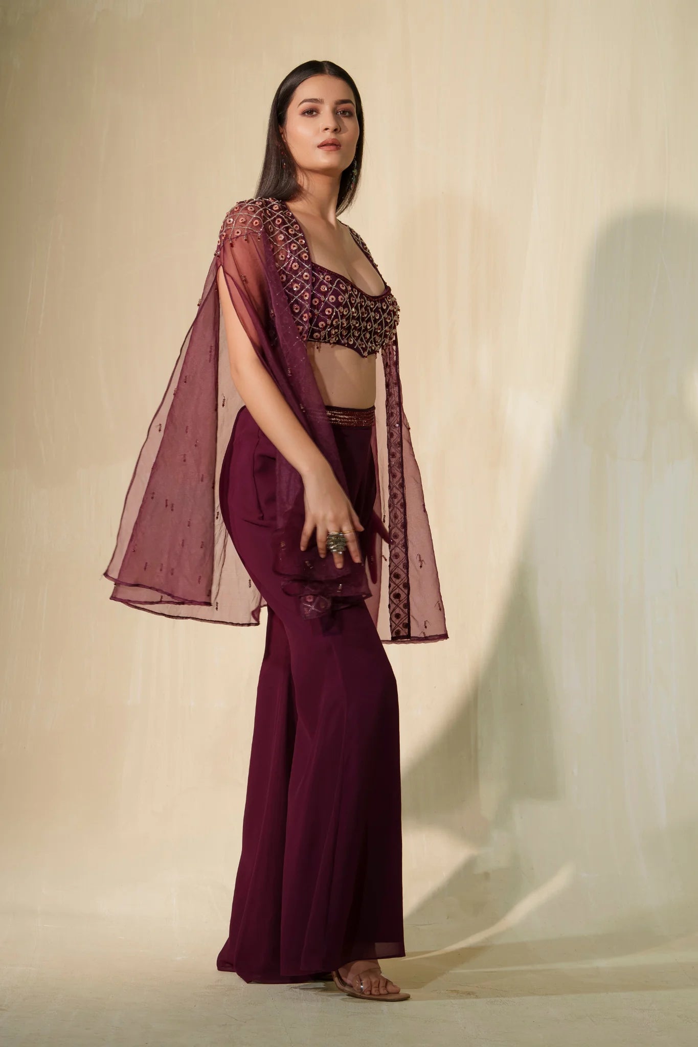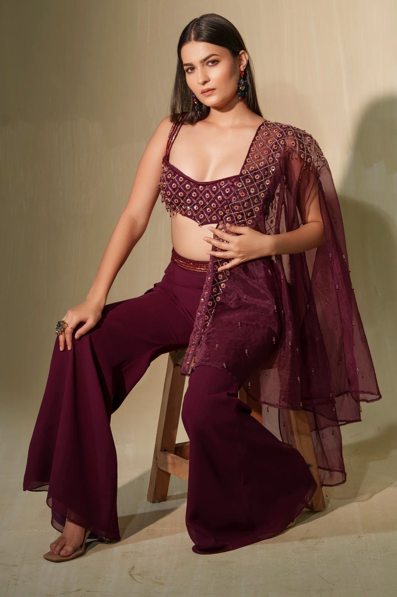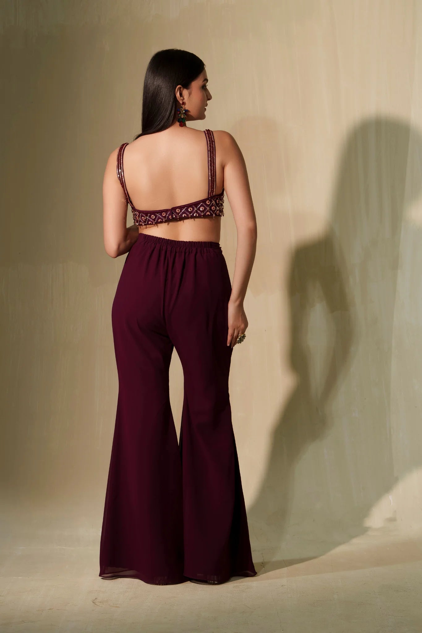 Embrace the allure of deep aubergine with our crystal and sequin embellished strap blouse, where the rich color sets the tone for a night of excitement. Paired effortlessly with flared pants in georgette, this ensemble is the epitome of a modern after-party look that’s as fun as it is sexy and comfortable.
