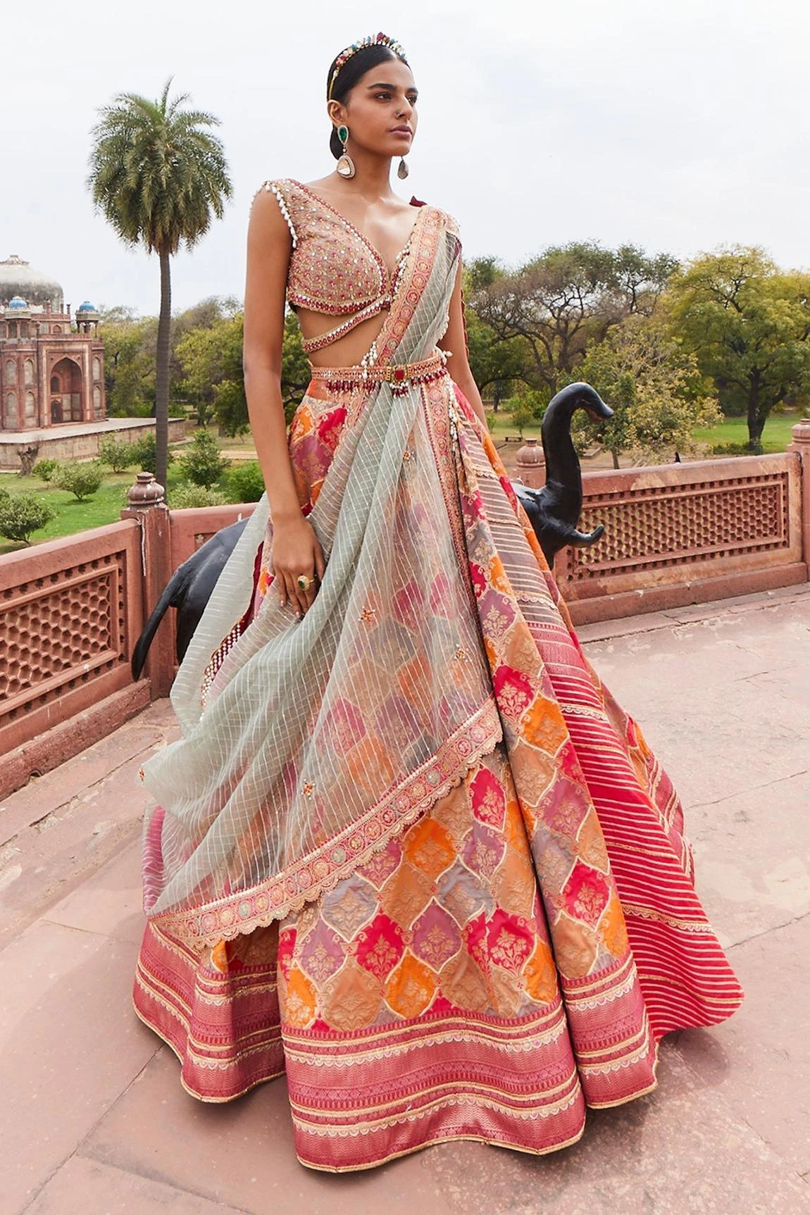 The Banarasi weave along with a peek-through panel, gives a hint of contemporary to the ogee pattern with colourful floral motifs making it a beautiful overall design. Paired with embroidered V-neck blouse. Light blue organza side draped dupatta and our signature AG belt.