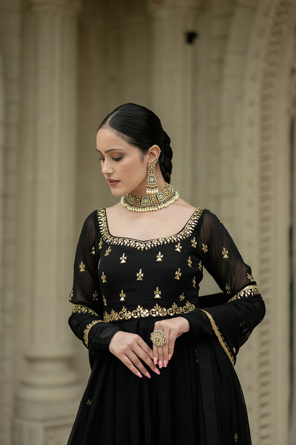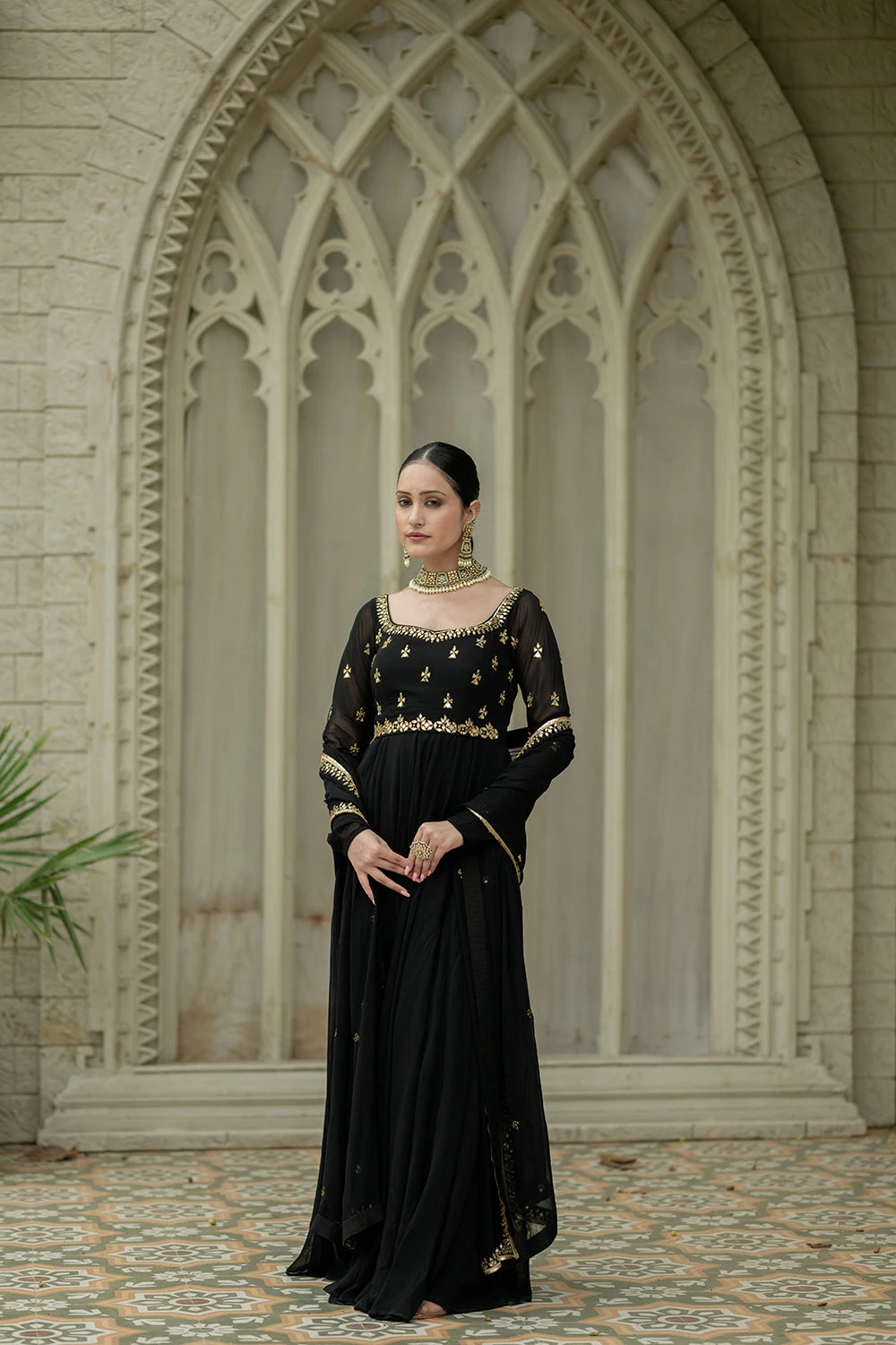 Featuring a black u shape neck anarkali embellished with mirror and sequence in georgette base . It is paired with mirror embroidered dupatta.