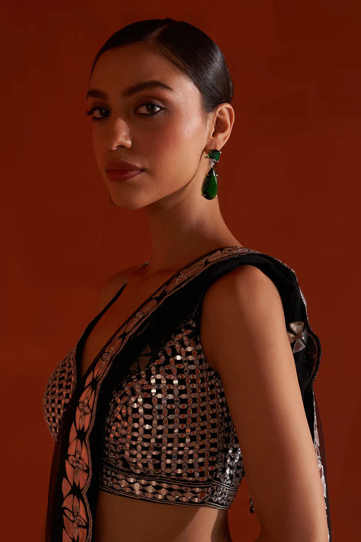 A black net saree embroidered with silver leather applique and mirror work encrusted with silver zari.