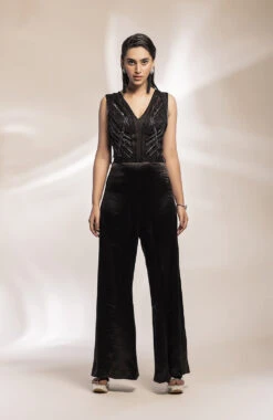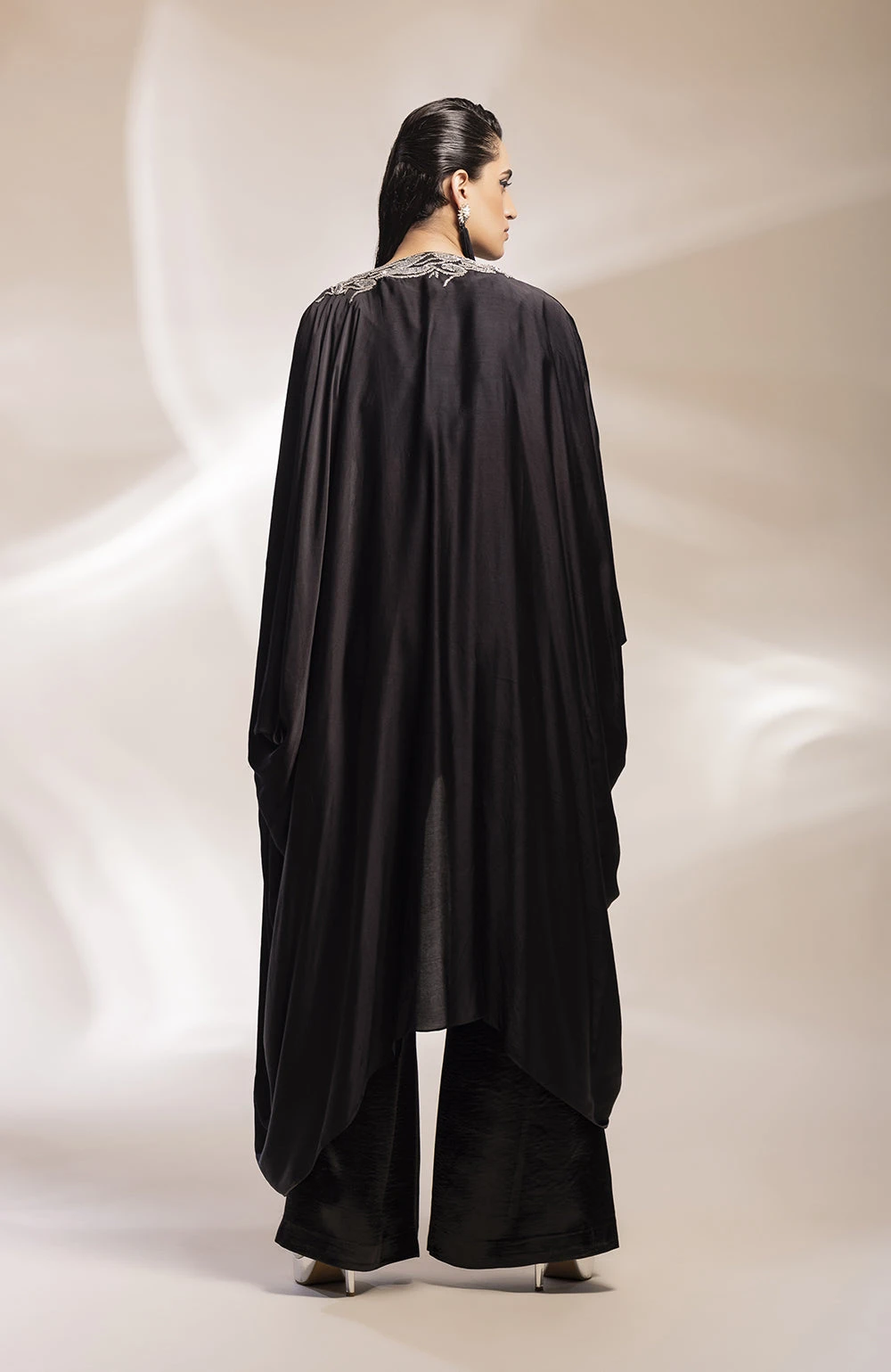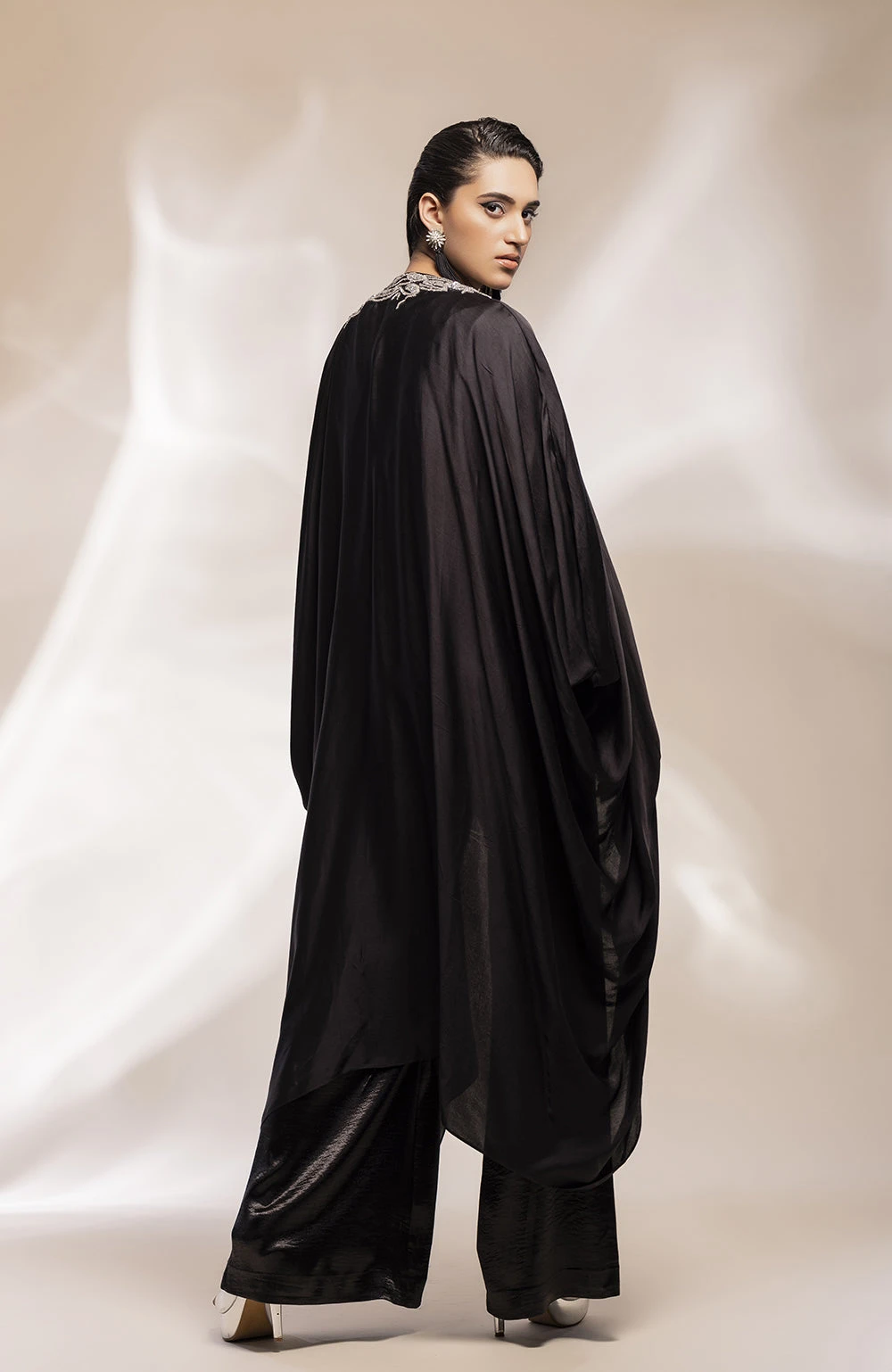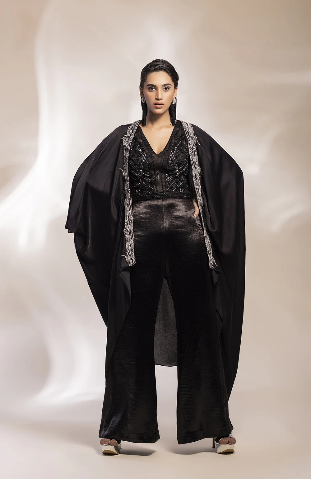 The black satin jumpsuit has tone on tone black and silver rope concept embroidery in beads and sequin on the front and back of the bodice. The addition of the sheer organza feature along the front neckline and sleeve adds a touch of delicacy.The modal satin cape has an intricate silver bead and sequin border. It can be worn on the shoulders and has arm slits too, converting it into a jacket cape. And the fact that it can be accessorized with other outfits makes it versatile.