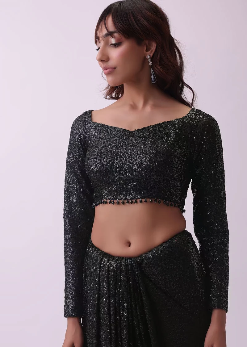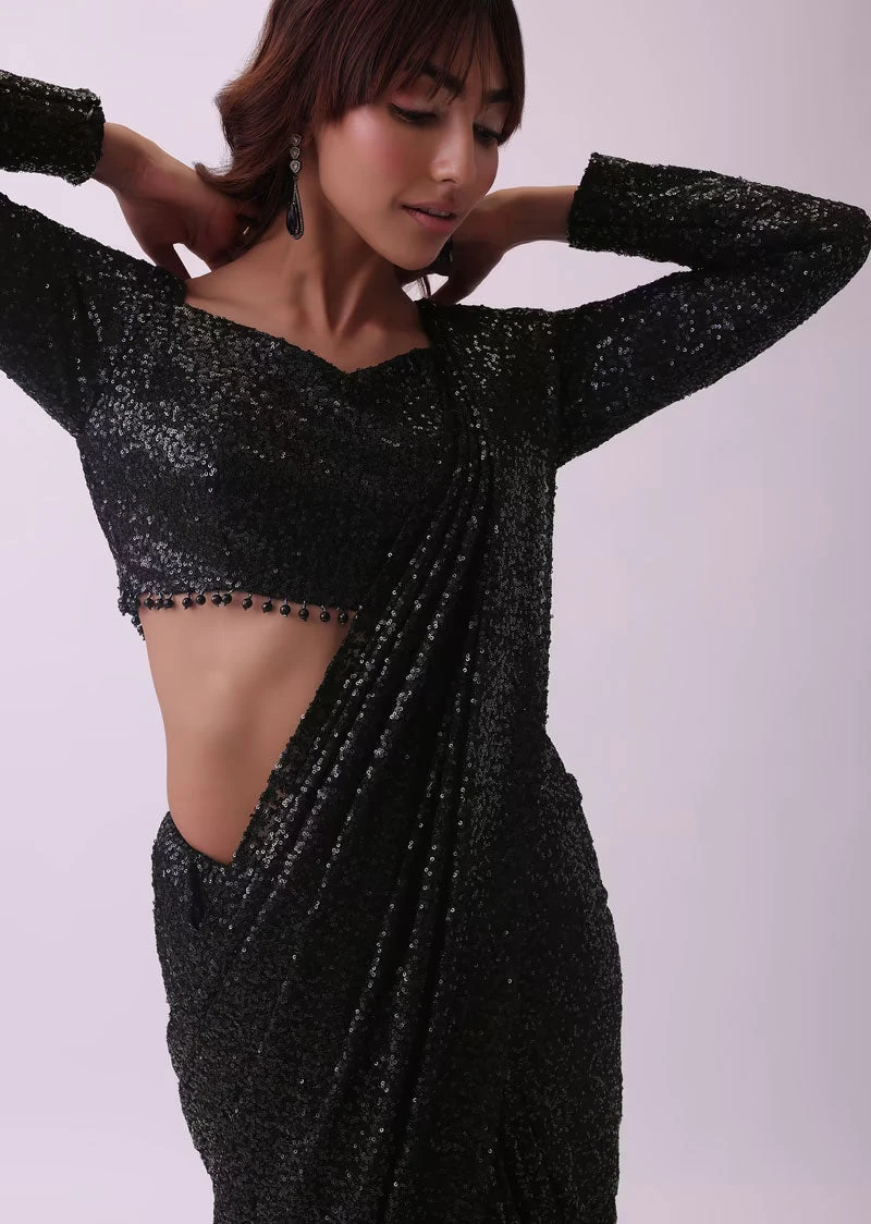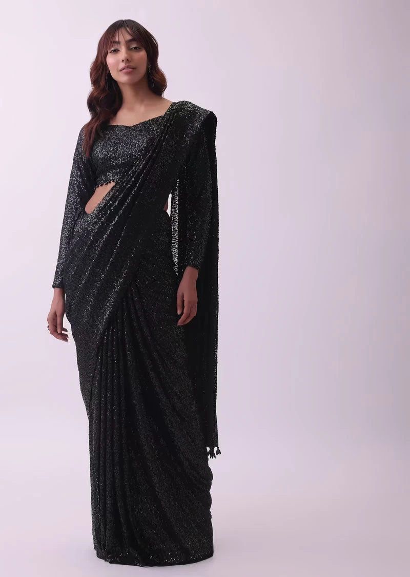 - Make a glamorous statement with our black sequins saree and blouse with crystal detailing.