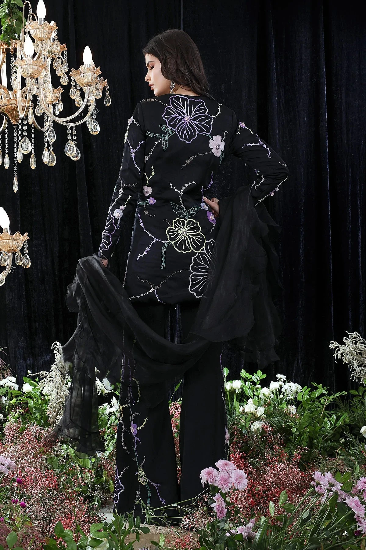 Black satin organza jacket with floral embroidery. Comes with embroidered pants and a ruffled organza dupatta.