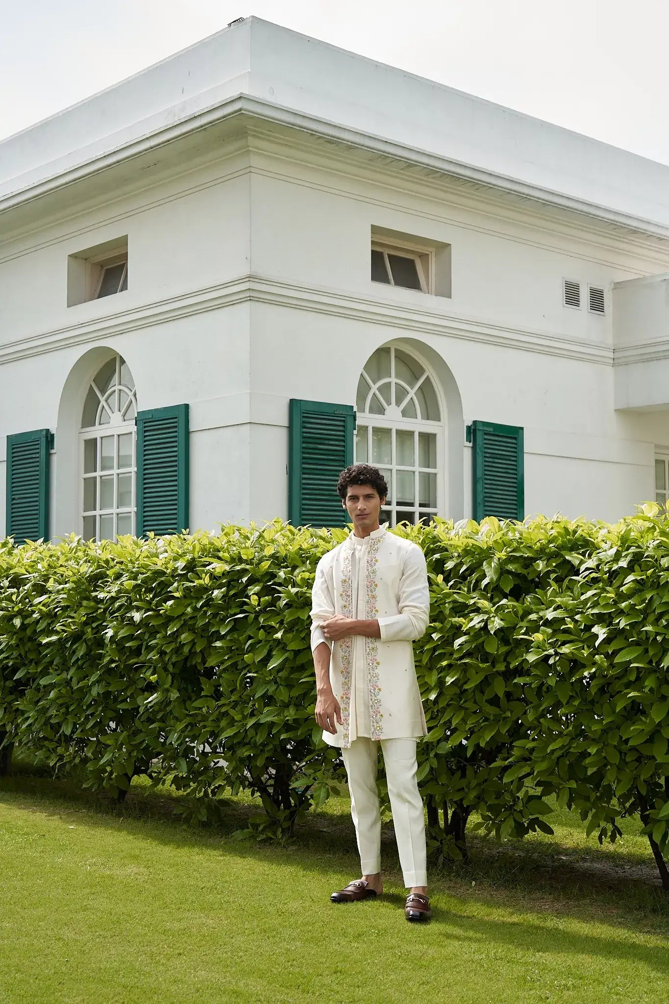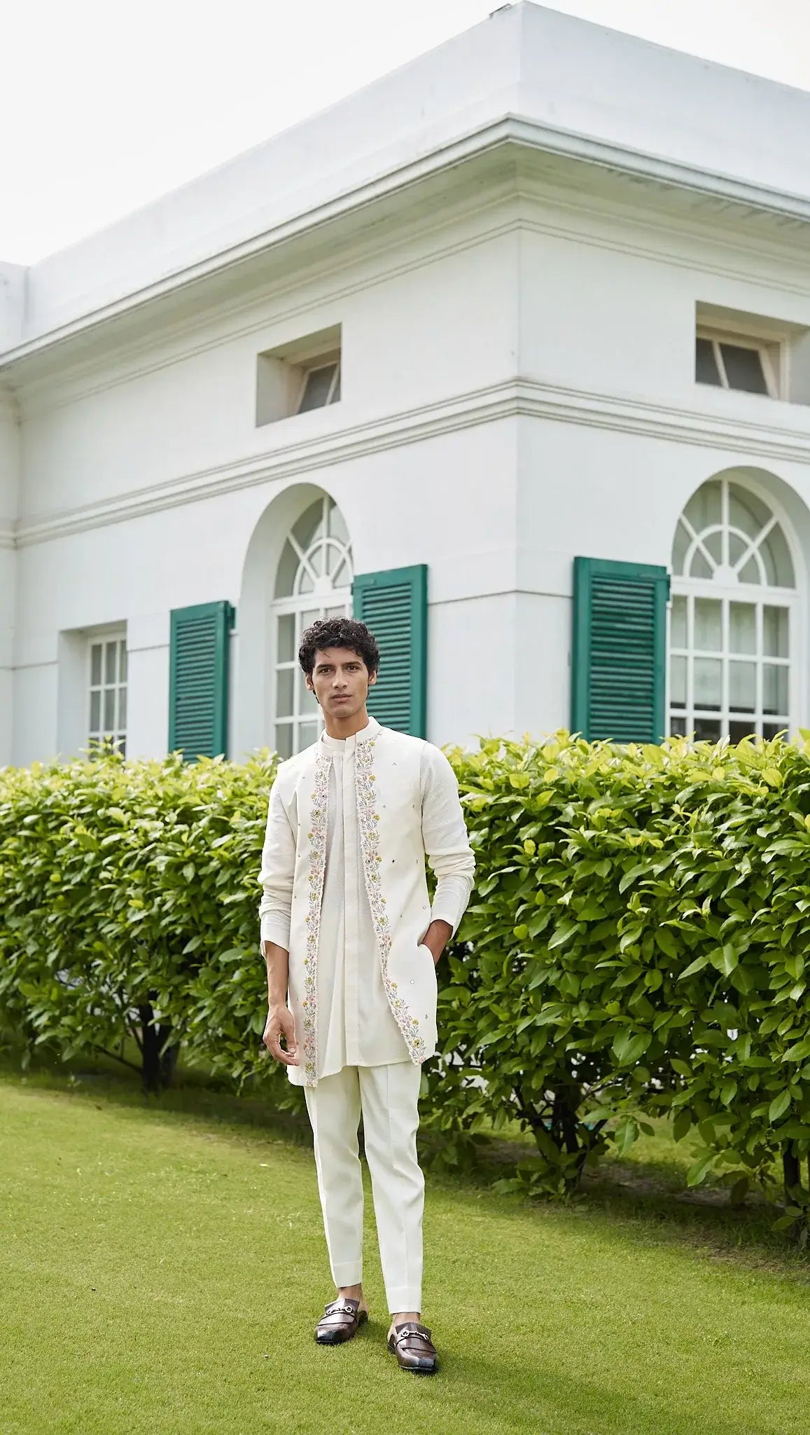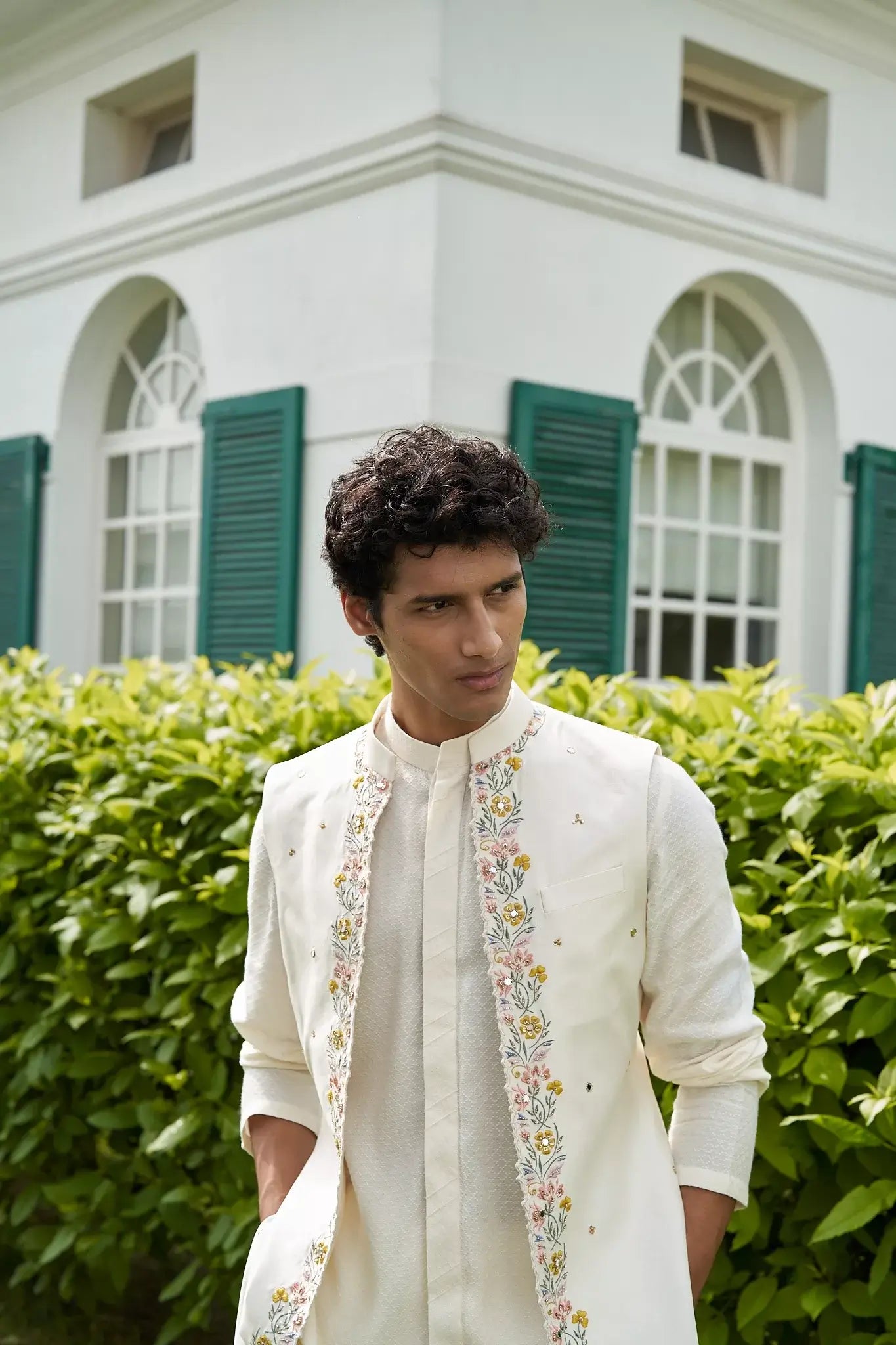A blossom of colours on white canvas. This shrug set features the most exquisite floral detailing. Telling a pastel story.