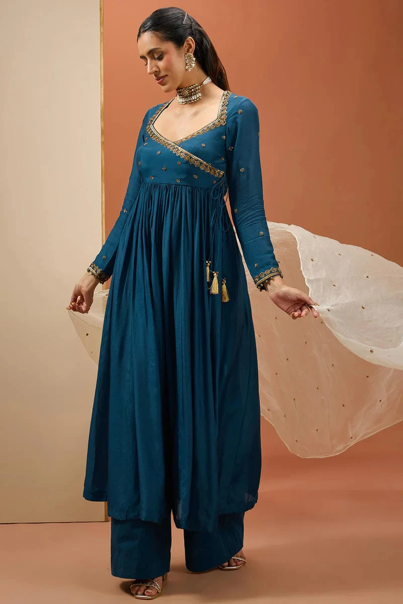 This consists of angrakha style anarkali with handwork on its neckline. It is paired with pants and dupatta