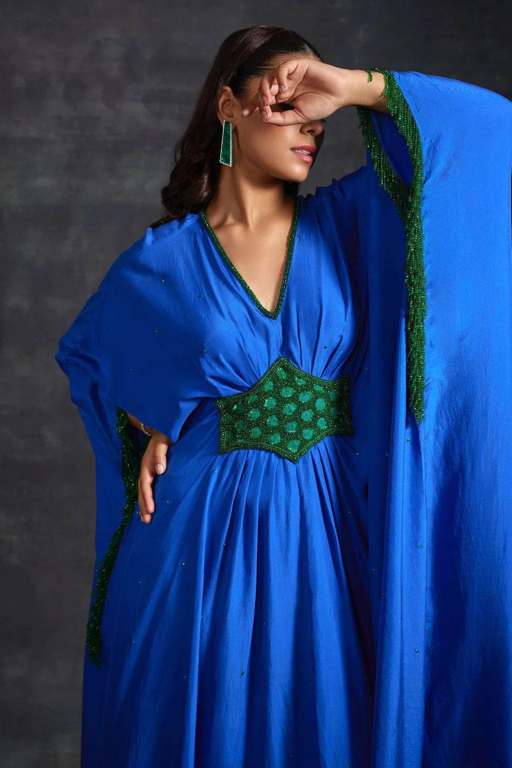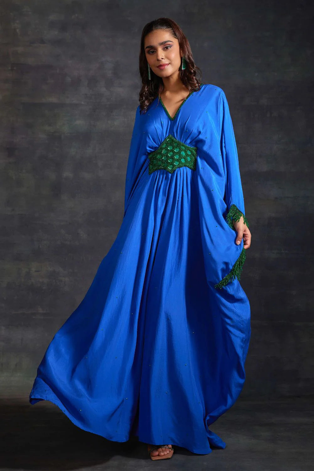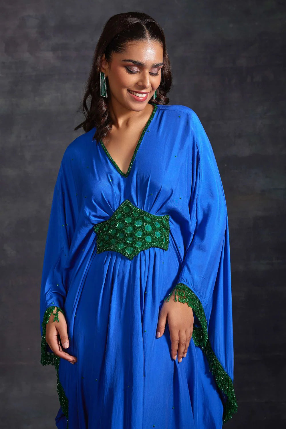 Kaftan-neckline edge embroidery, 2” hanging tassels on sleeves hem, Emerald green Honey comb embroidered under bust.