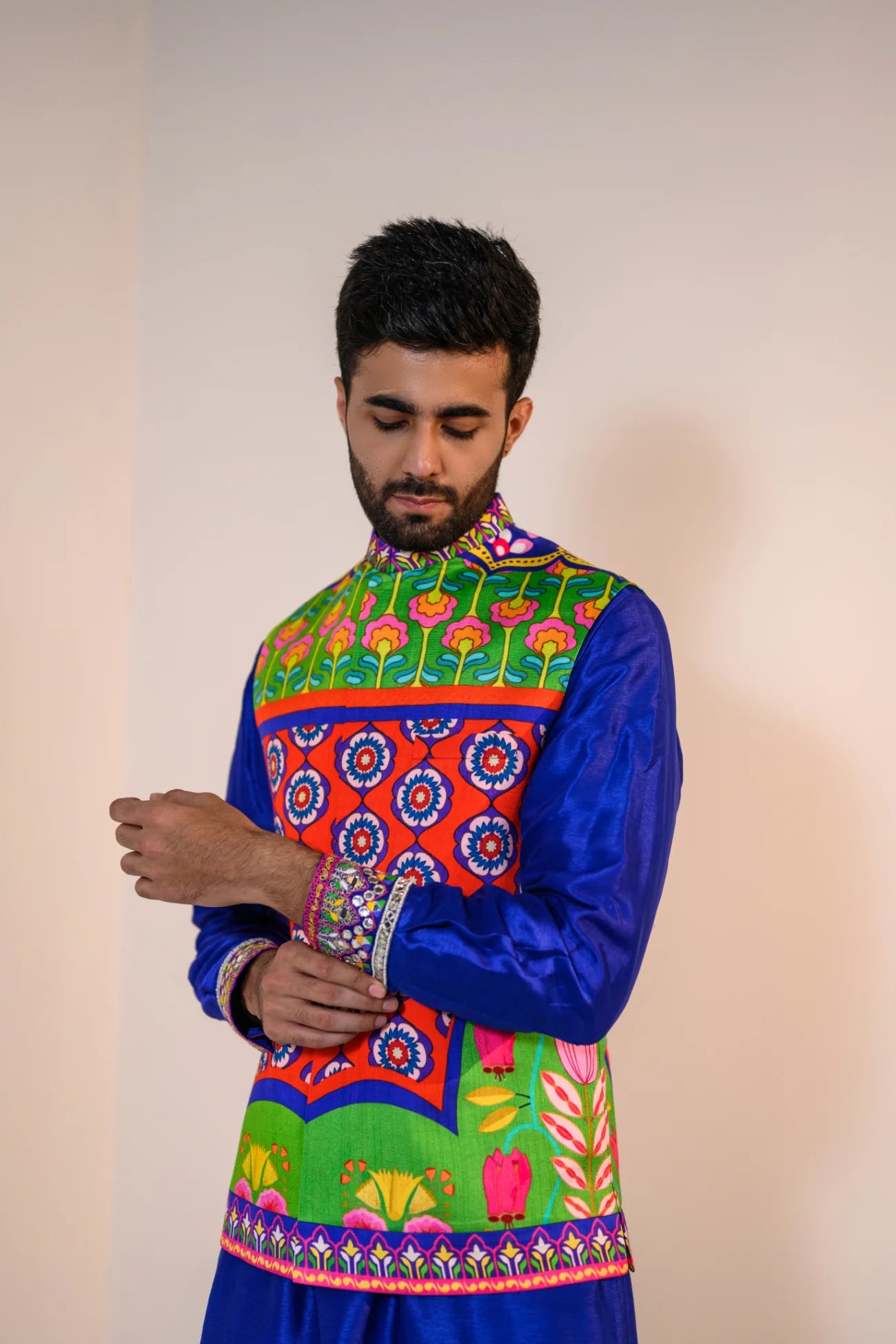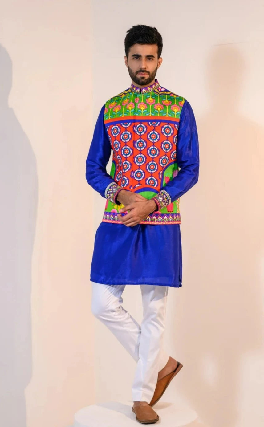 Our Blue Kurta With Embroidered Cuff Paired With Our Veronica Bundi And Pants.