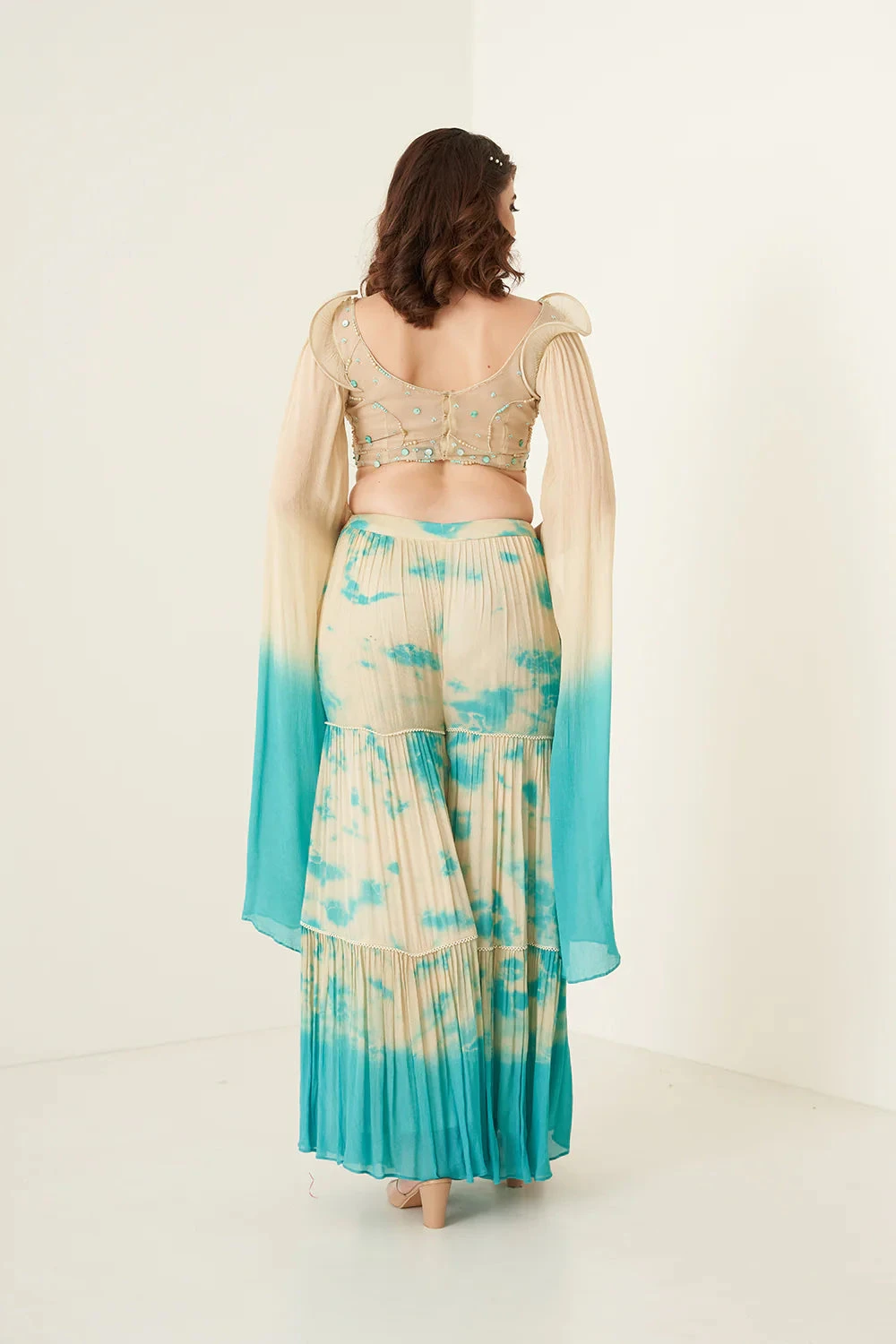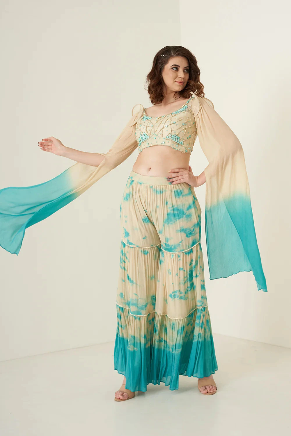Blue Co-ord Set Comes With A Flared Pants, Paired With Embroidered Blouse.