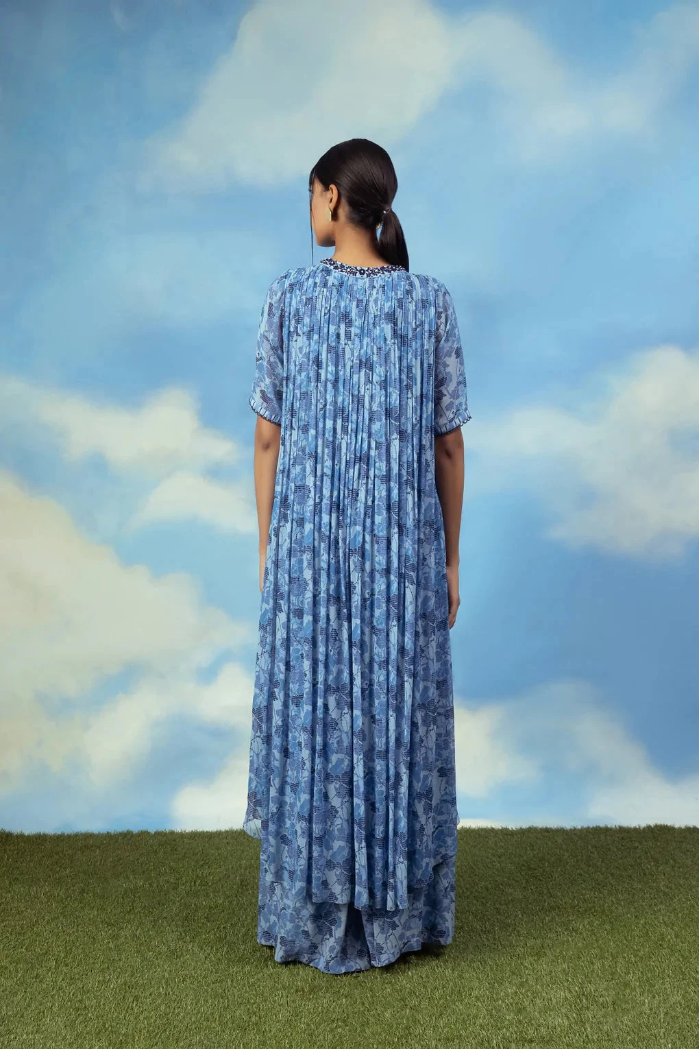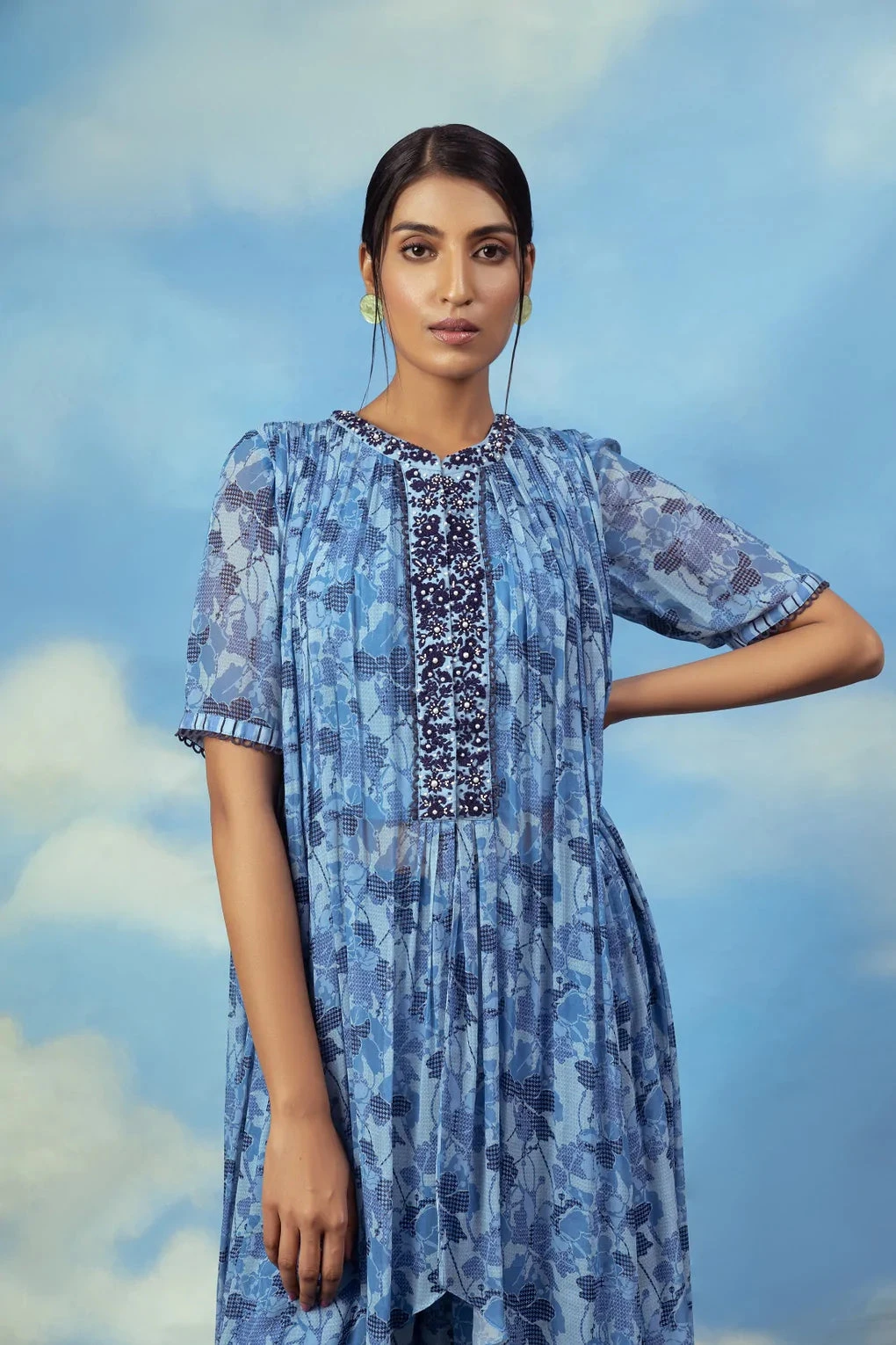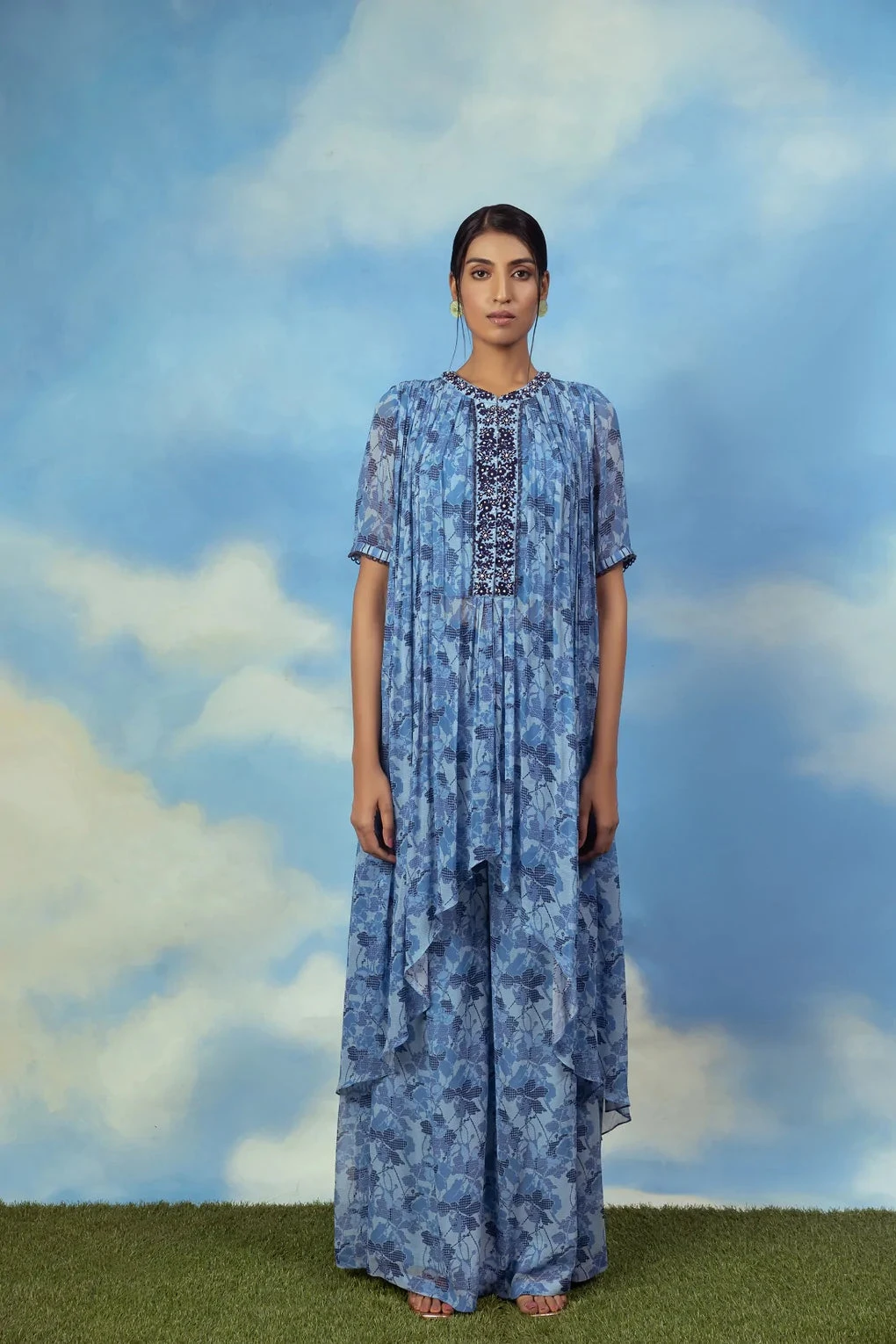 Blue printed asymetrical top with palazzo pants. the top has embroidered collar and yoke with thread and pearls combined. The half sleeve of the top is finished with stripes fabric and lace details.