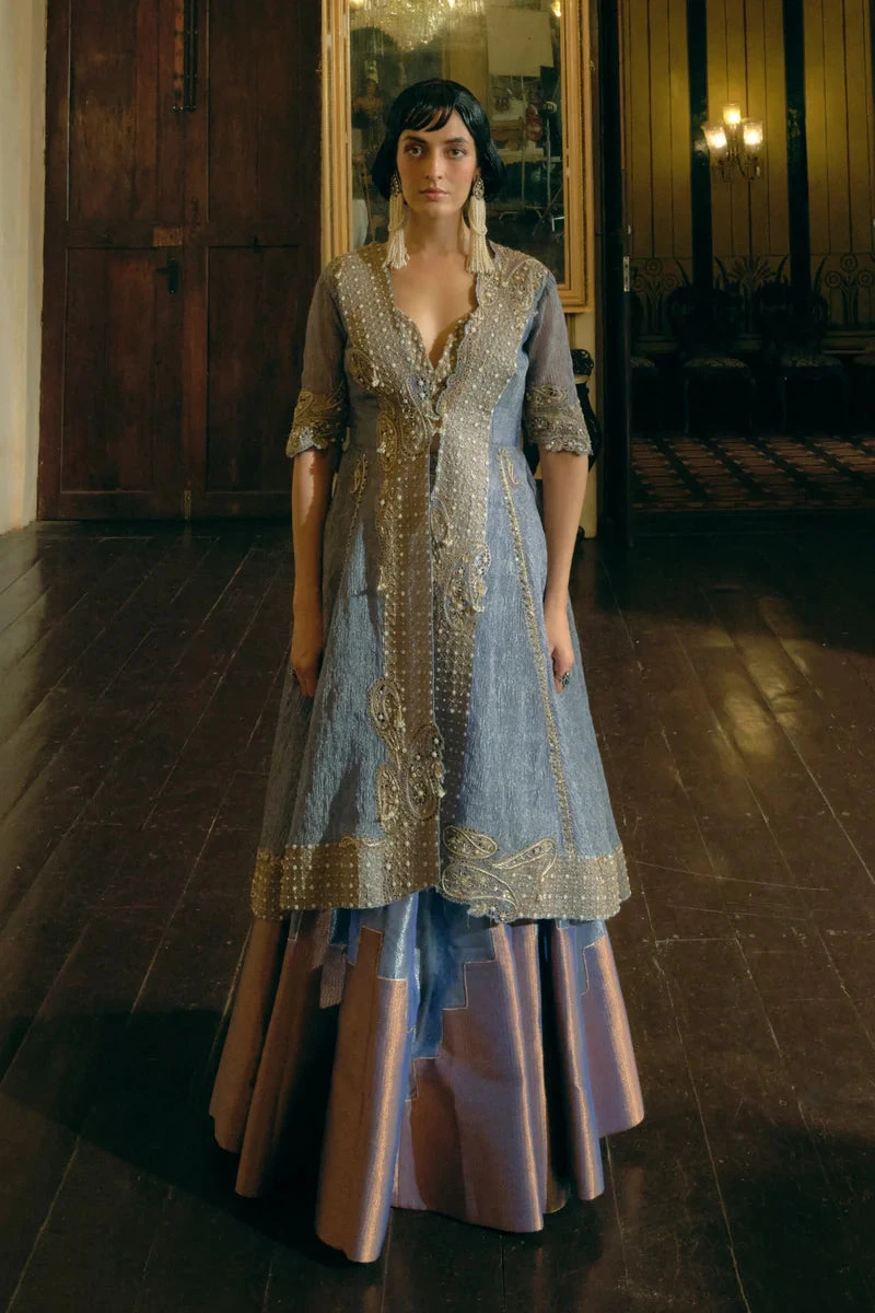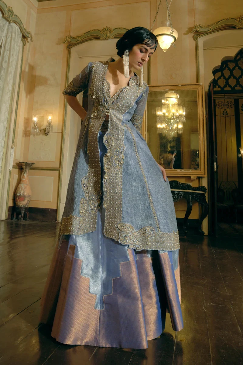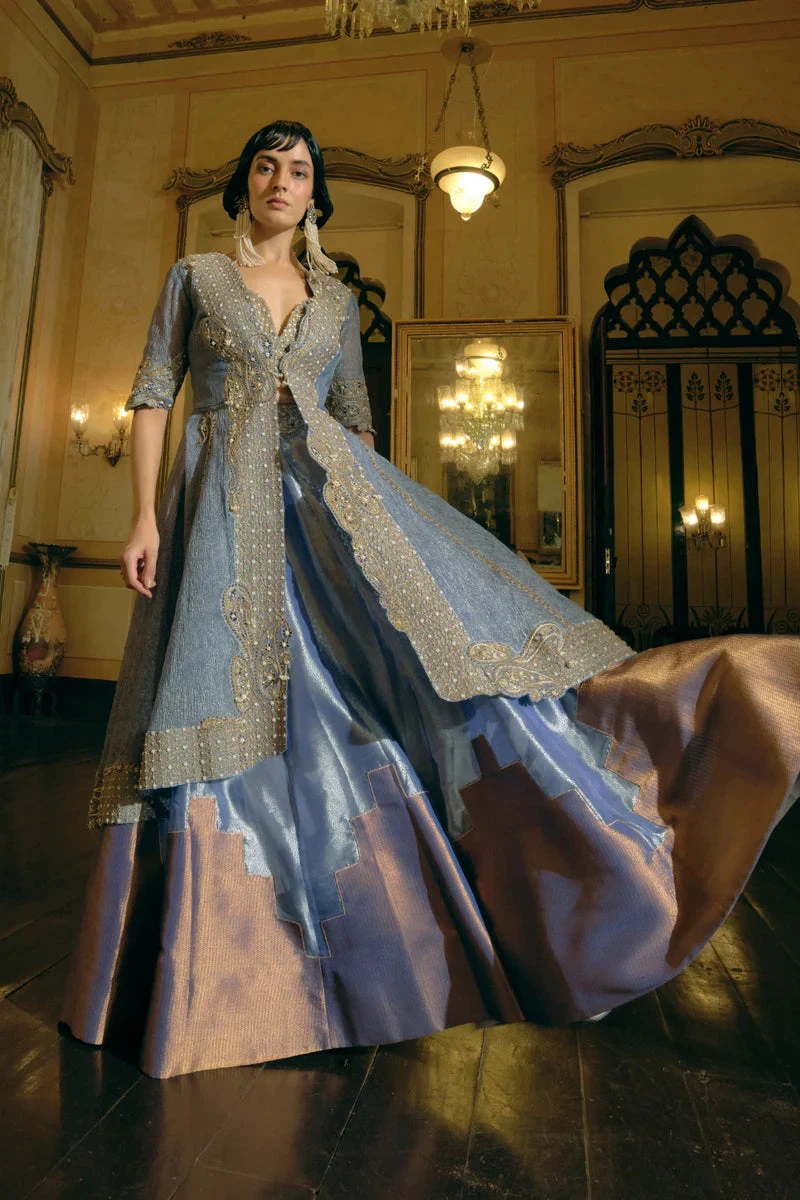 This classic Kalidar lehenga set in blue silk zari tissue and Jacquard silk Banarasi showcases intricate paisley embroidery, complemented by detailed embellishments. The ensemble includes an embroidered blouse and a long blue crushed tissue jacket, adorned with intricate embroidery and pearl details.