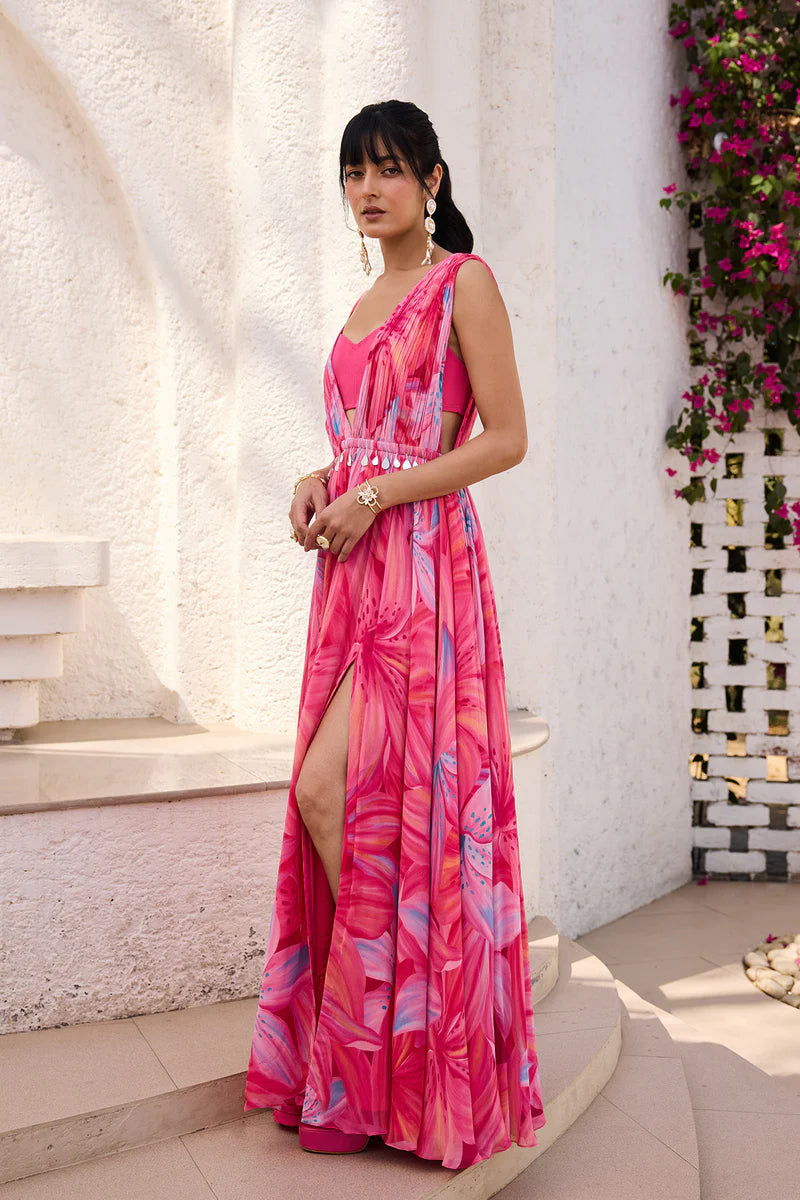 Blush Pink Printed Slit Dress With Solid Pink Bustier
