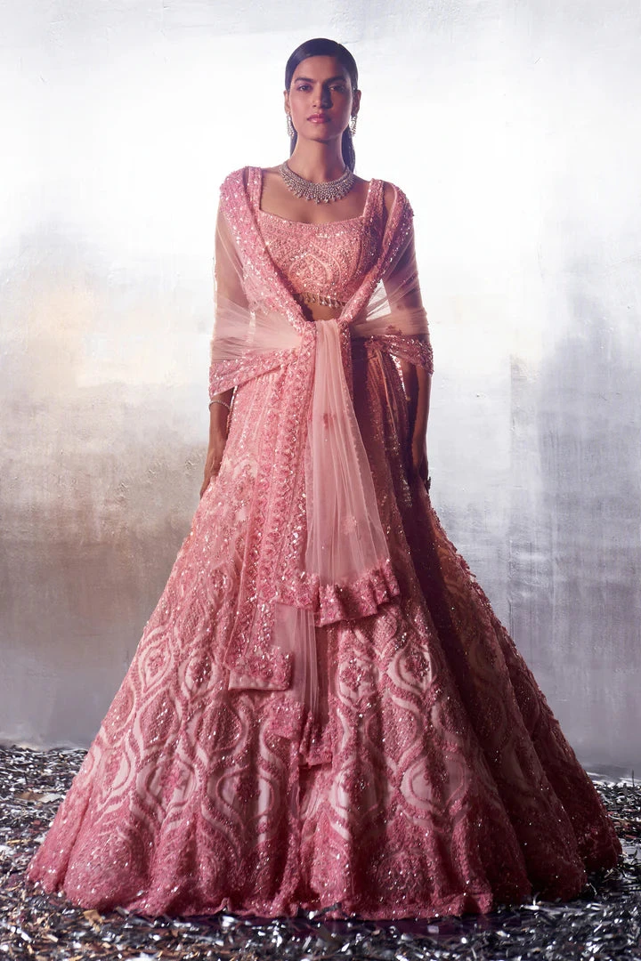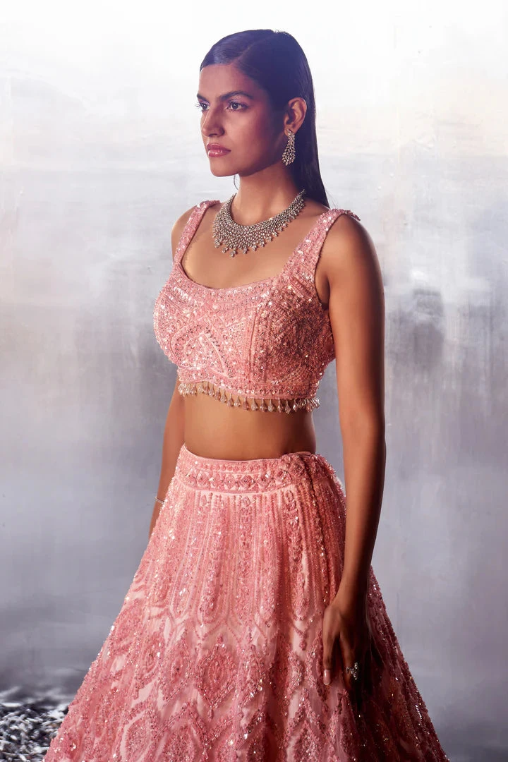 A blush pink net lehenga set embroidered with tonal sequins, crystals and bugle beads.