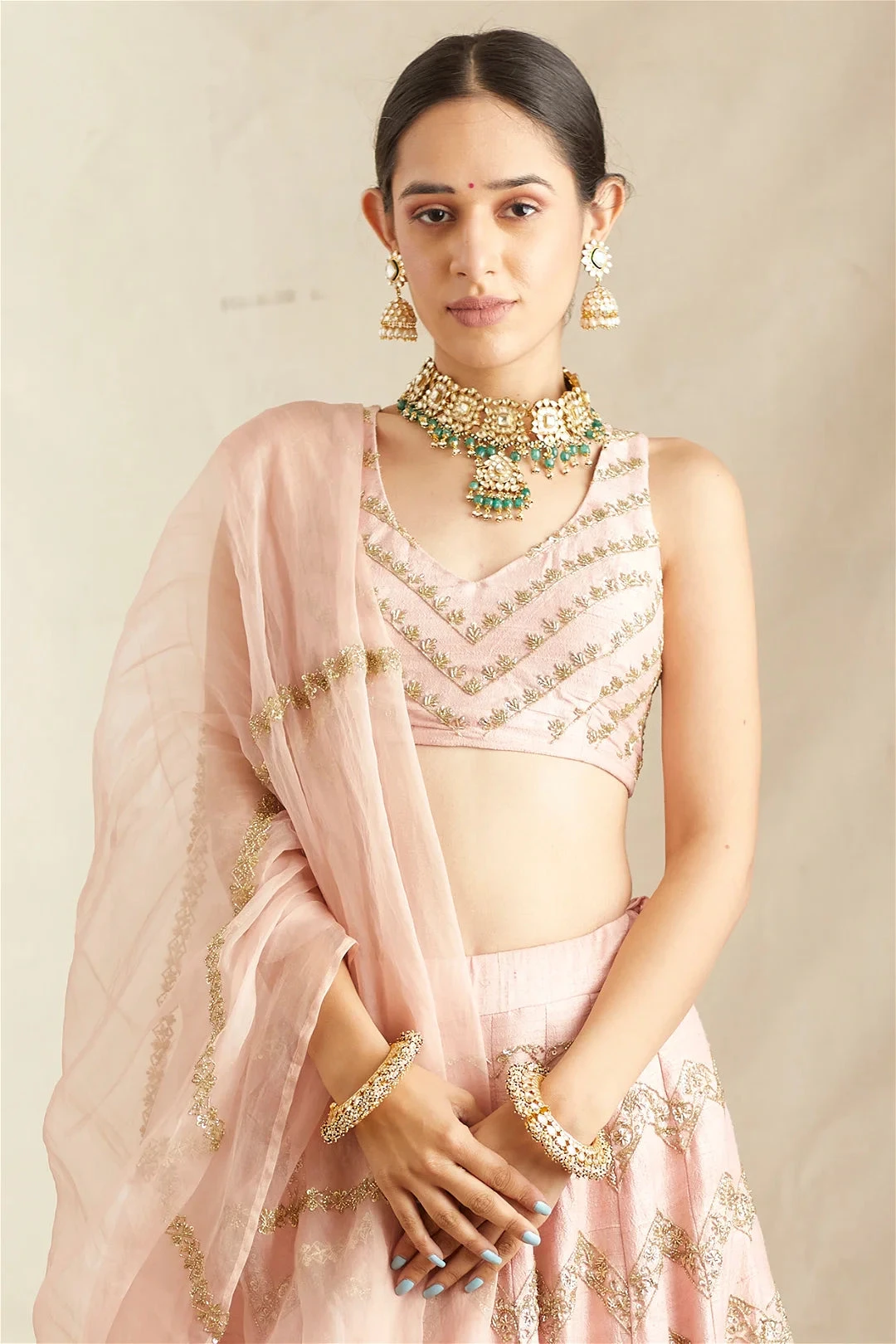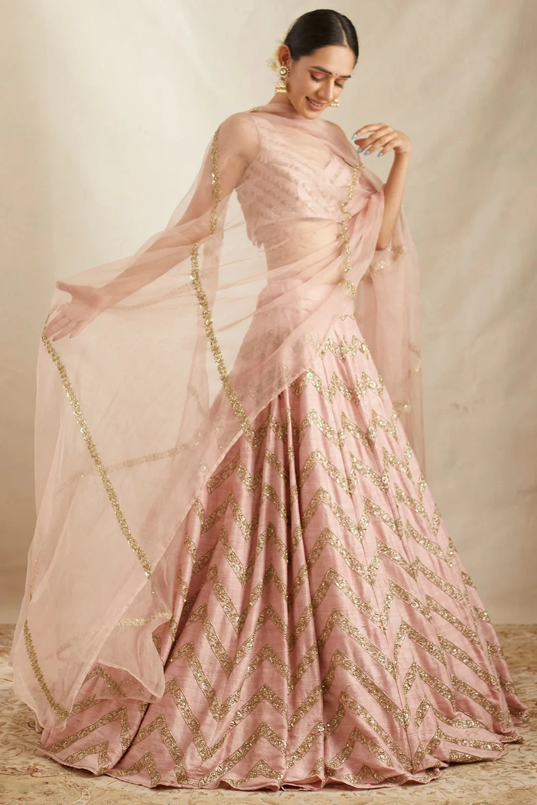 - Blush Pink Raw Silk Zig Zag Lehenga Set