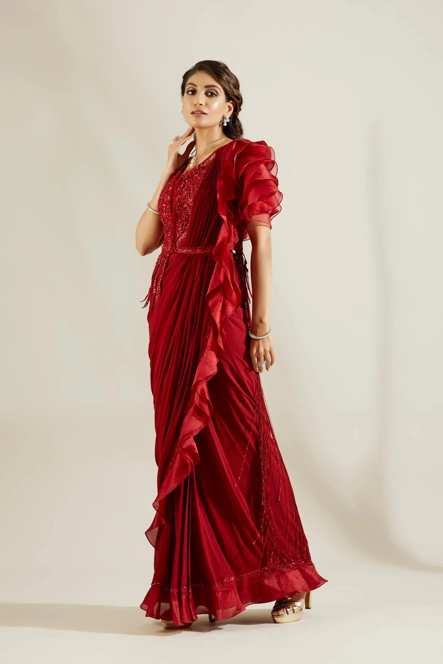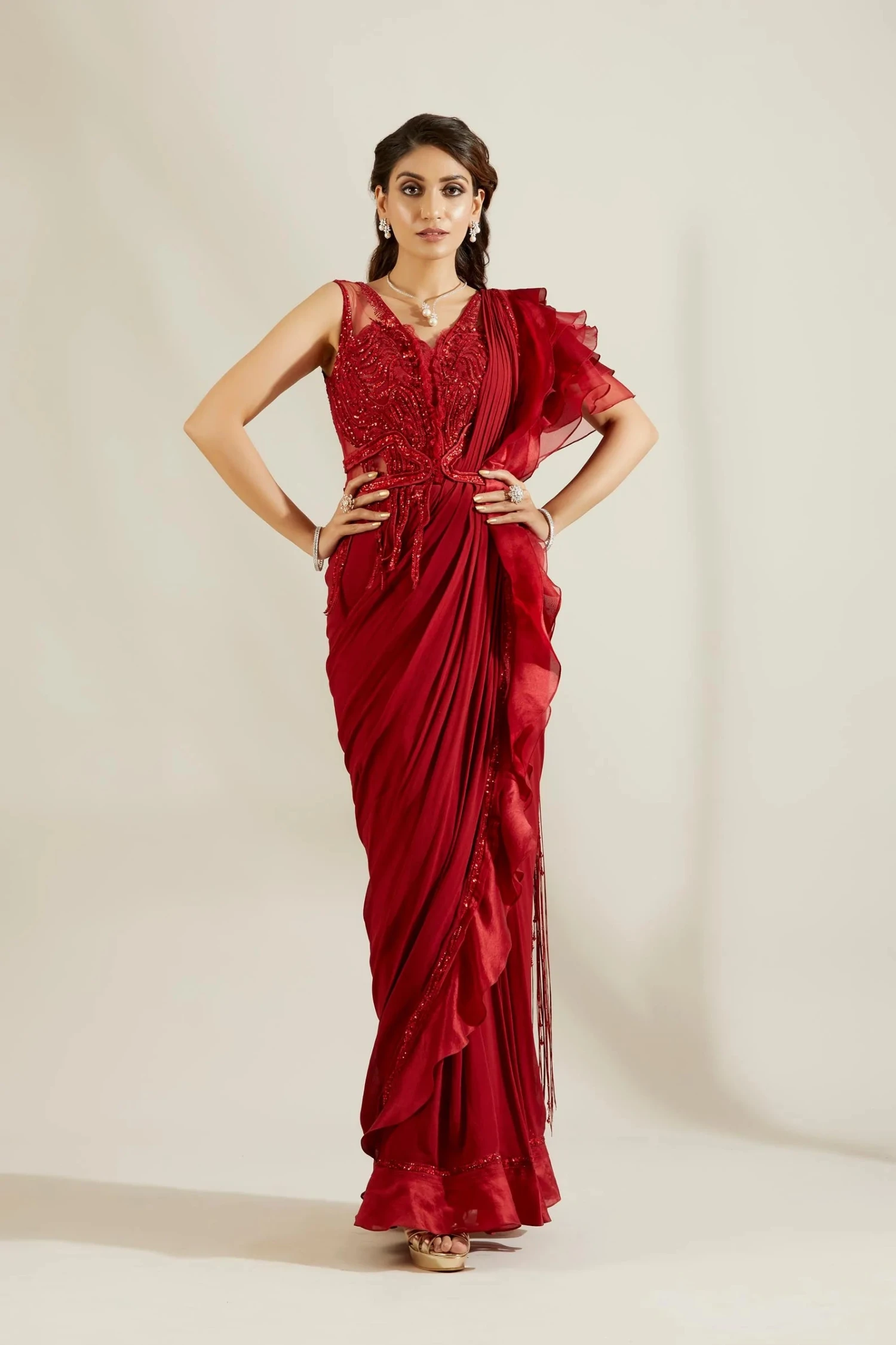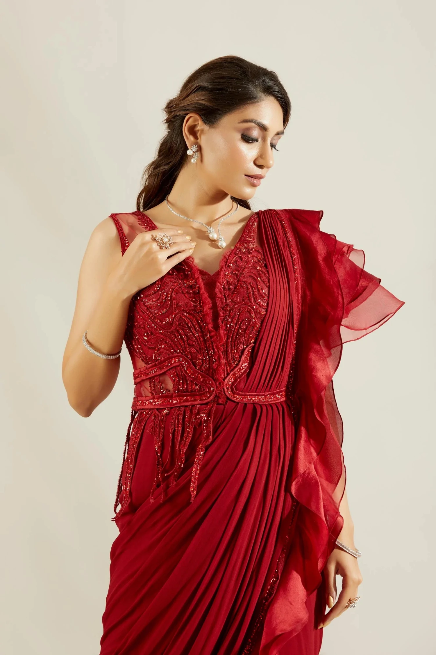 Crimson red saree gown with pleated, frill border pallu, sequin embellished & corset style bodice.