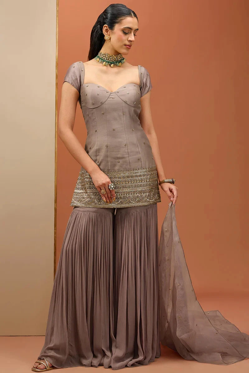 This Consists of Corset Kurta With Handwork border on it . It Is Paired with dupatta & Sharara