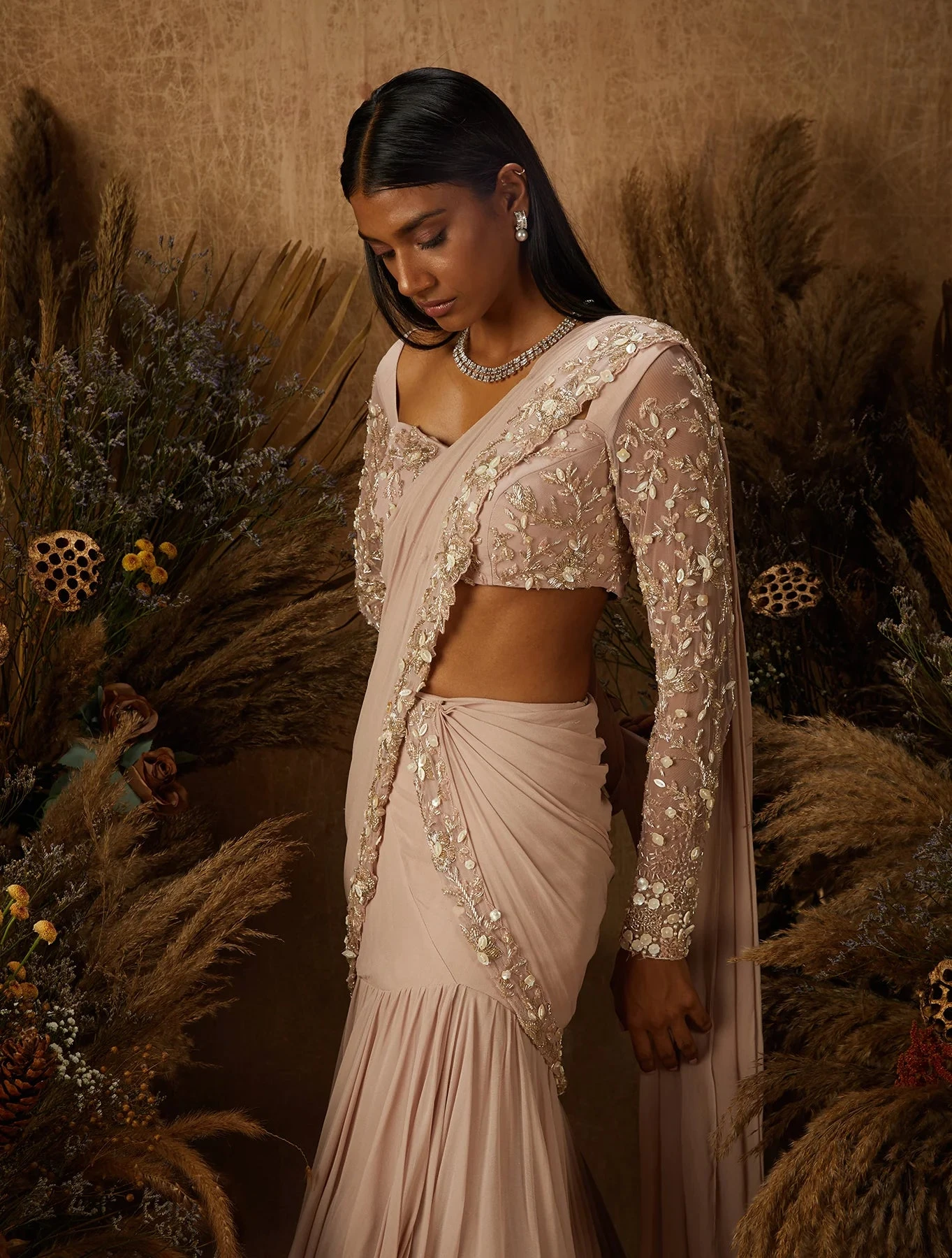 Dusty pink layered skirt with attached pre-draped and pre-stitched pallu featuring a hand embellished floral zardozi and mother of pearl border. Paired with a matching embellished blouse with a sweetheart neck & sheer sleeves, and a tie back.