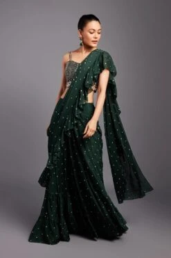 Georgette Pre draped ruffle Saree Paired With zardozi and glass beads Embroidered Bralette