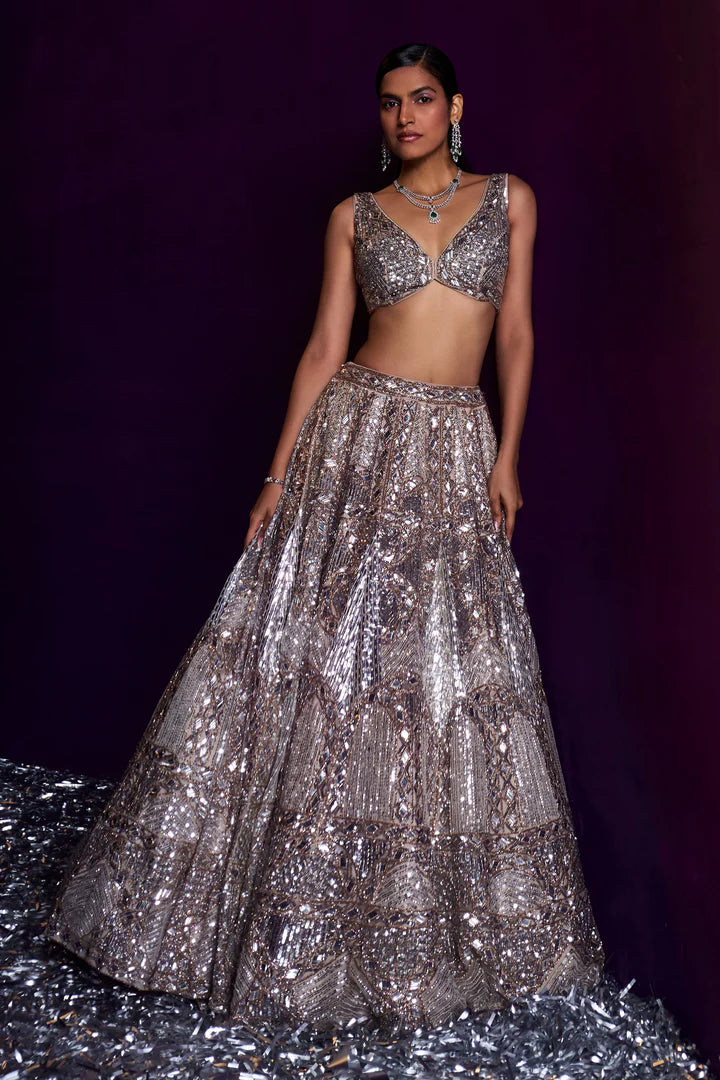 Champagne Organza Lehenga Set embroidered with multicut silver sequins and rose gold glass beads accentuate with crystals.