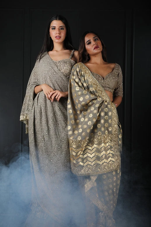Chikankari half n half saree with zardozi blouse , an ideal addition to your festive closet , an easy to wear style that can be worn for various festivities all year around, an ideal color to compliment your traditional jewellery and flatters all body types