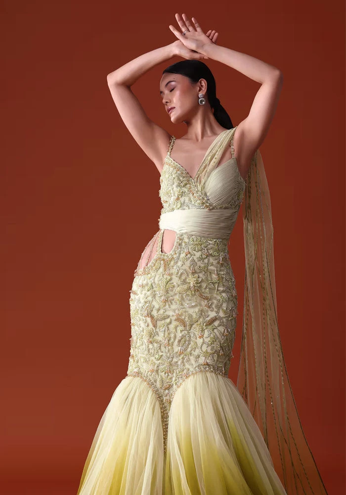- The gown saree features a lovely fish cut silhouette which is beautifully draped to accentuate your curves with effortlessness.