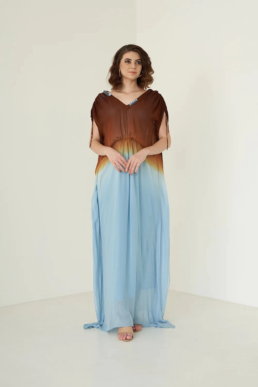 Ombre Shaded Coffee Brown Kaftan Enhanced With Neck Embroidery.