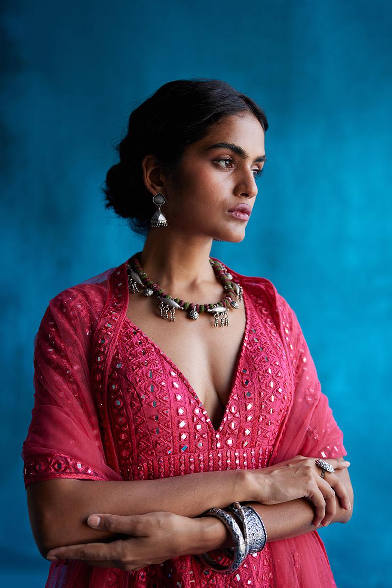 - Sheer dupatta with mirrorwork cutwork border