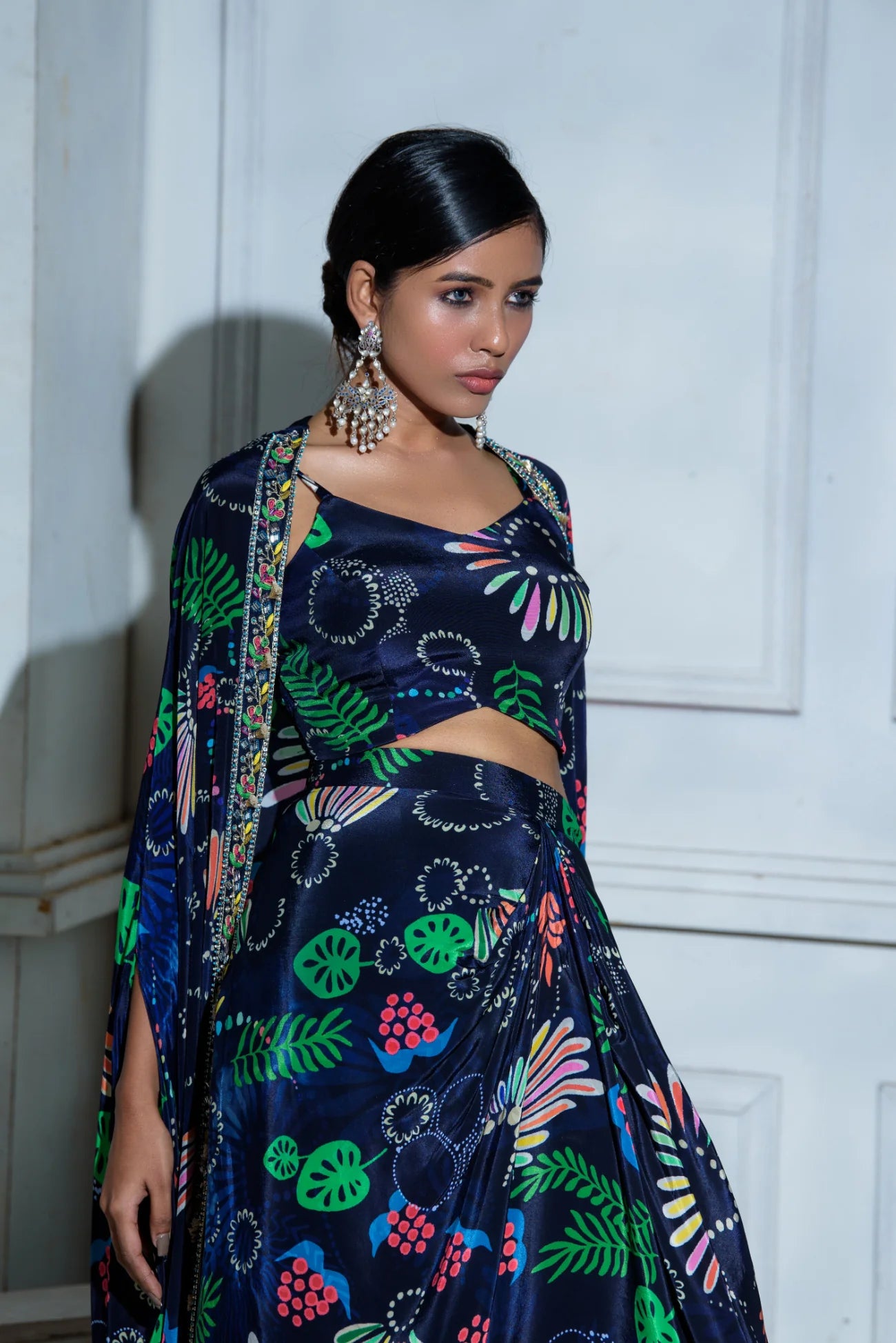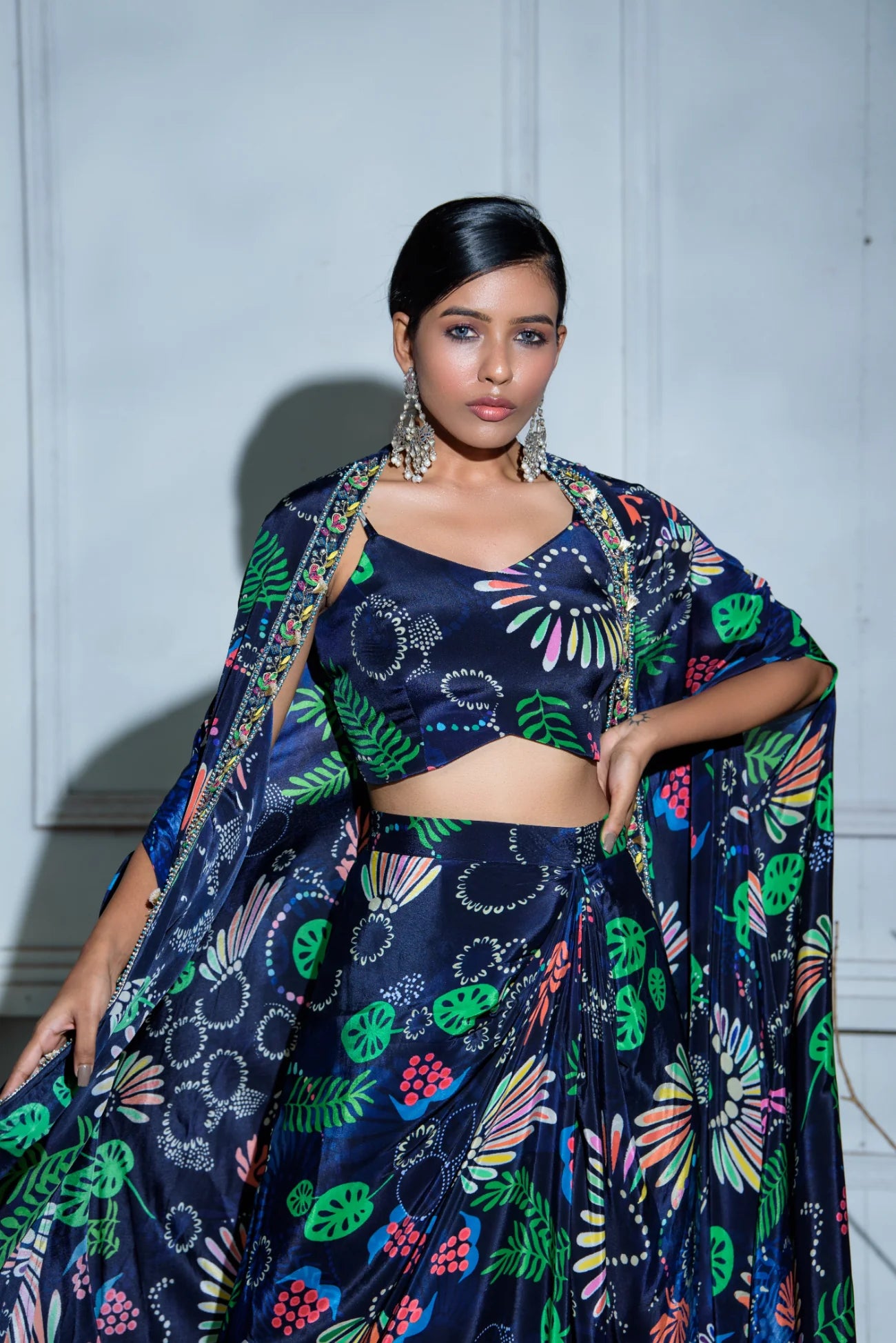 Be the first to review “Cowl Dhoti Skirt Set With Bralette And Cape” Cancel reply