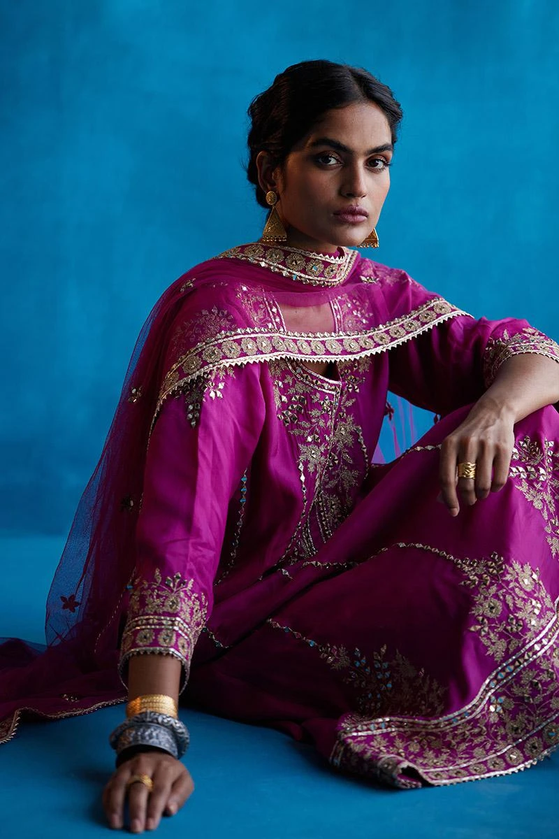 Crimson Anarkali with kasba, mirror work and Gota Patti embroidery. Comes with a salwar and net dupatta.