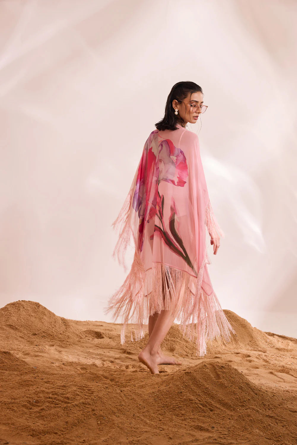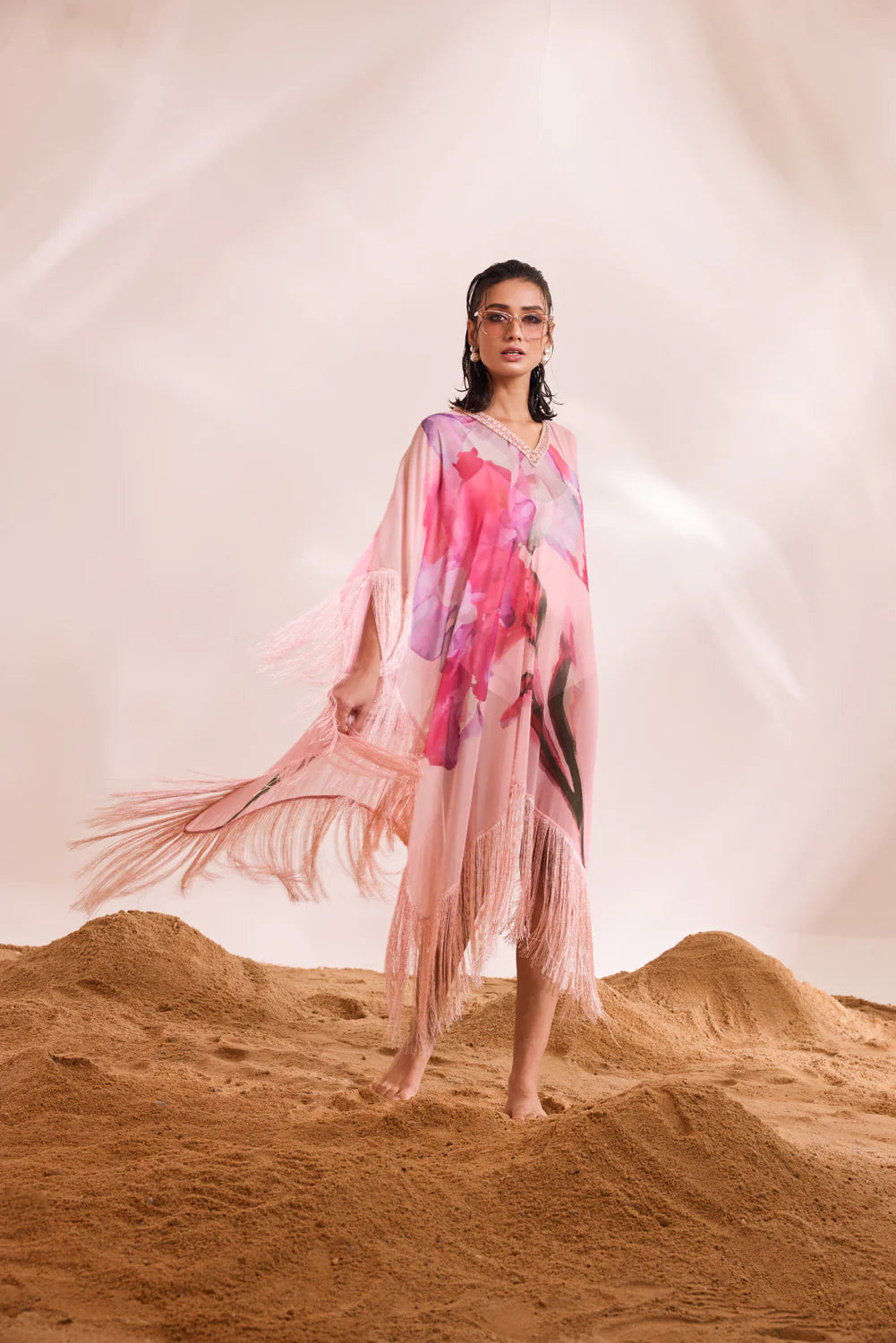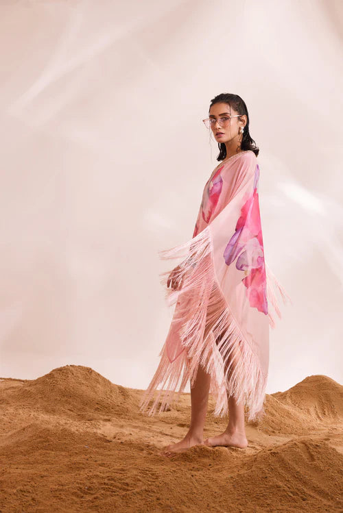 Immerse yourself in the fluidity and breeziness of our DAHLIA Kaftan Set. This set includes a printed kaftan with a solid slip dress, featuring mesmerizing abstract floral motifs, fringe accents, and scintillating embellishments.