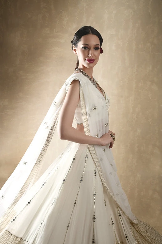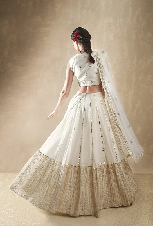 This set features a porcelain white lehenga set. The georgette skirt has lines of gota and mirror work buttas descending into a thick sequin & zari embroidered border. The silk blouse has buttis embroidered pearl and mirror edges. A net dupatta with matching buttis and border completes the look. Cancan & pockets are included.