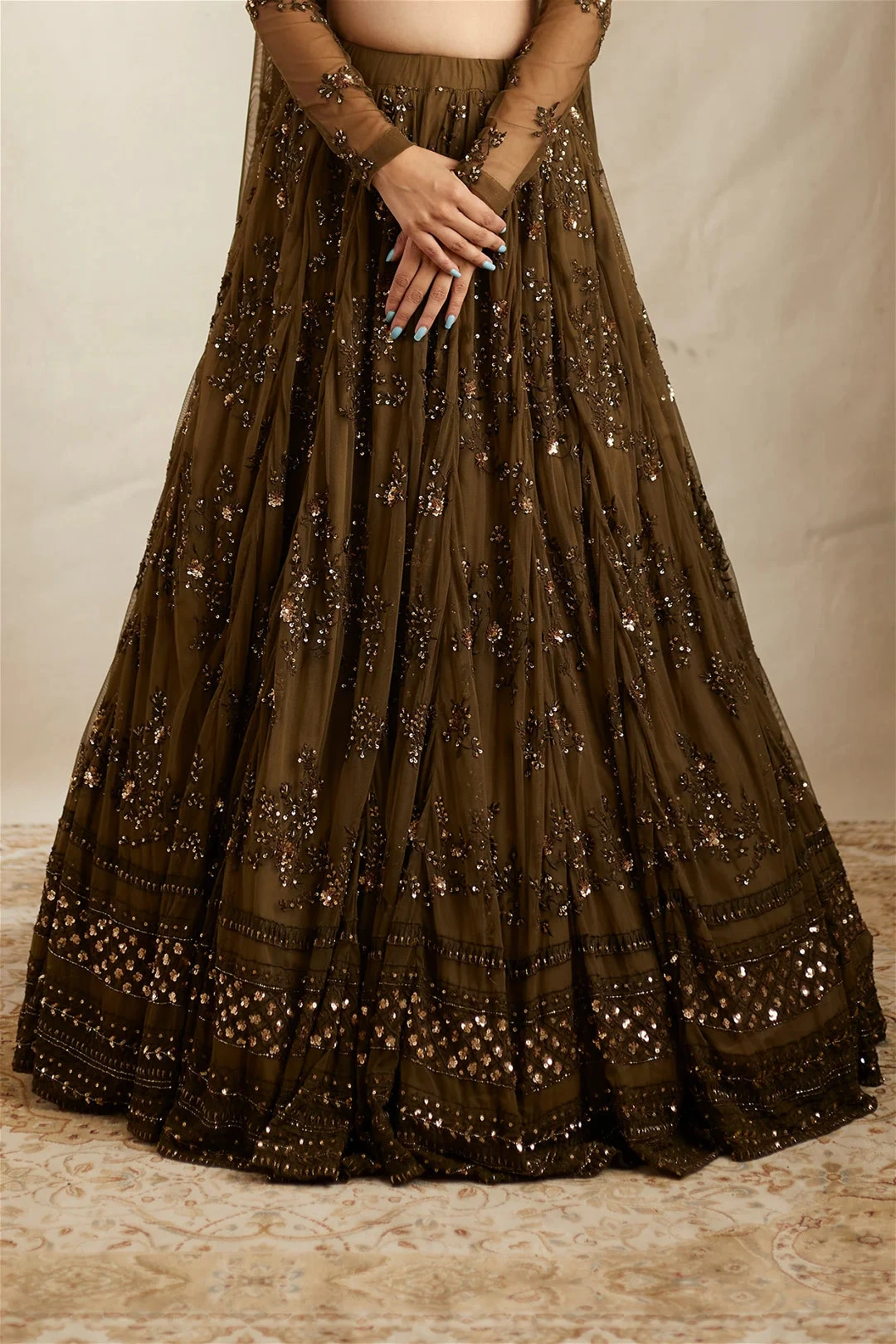 - Dark Green Thread Work With Highlight All Over Lehenga Set