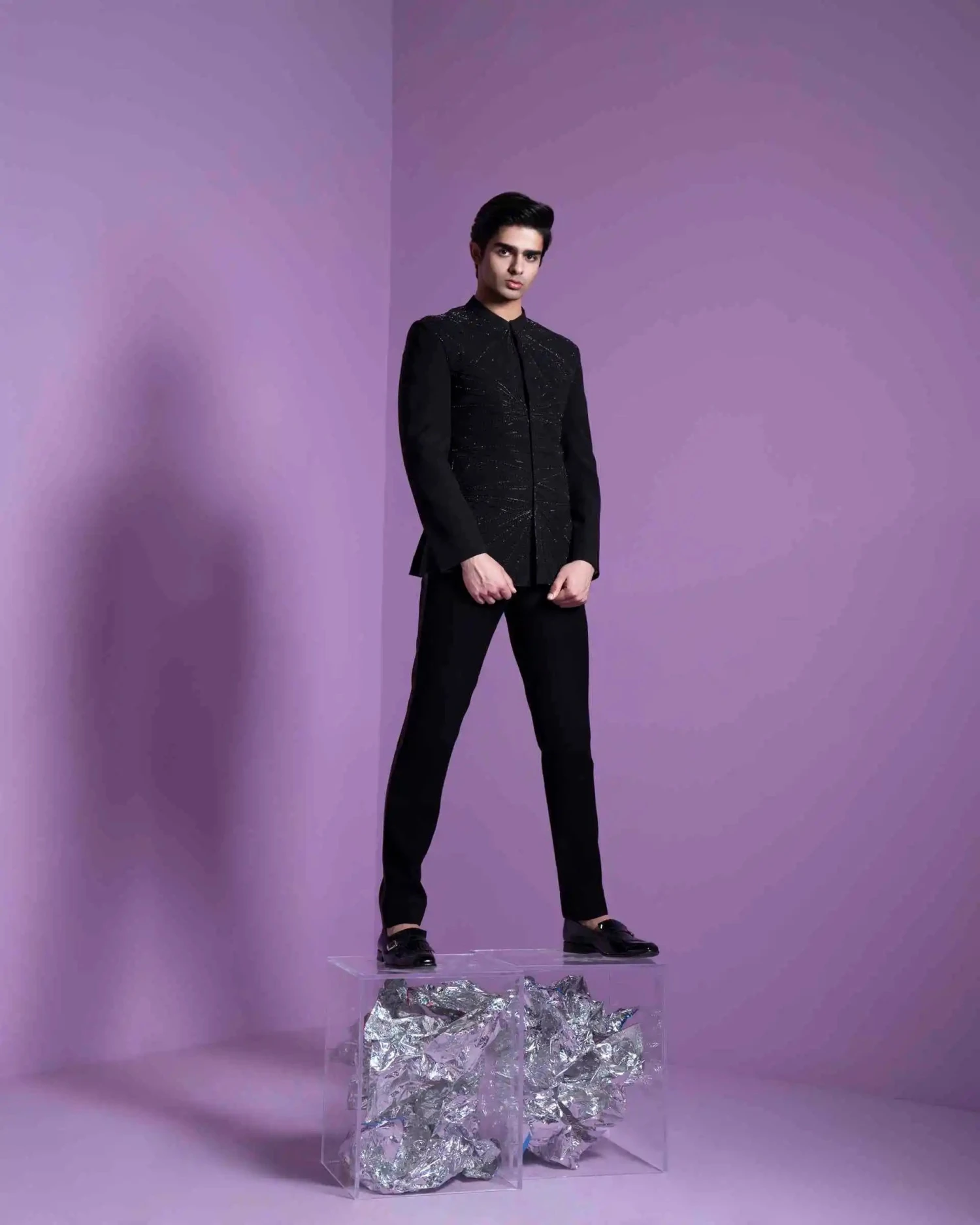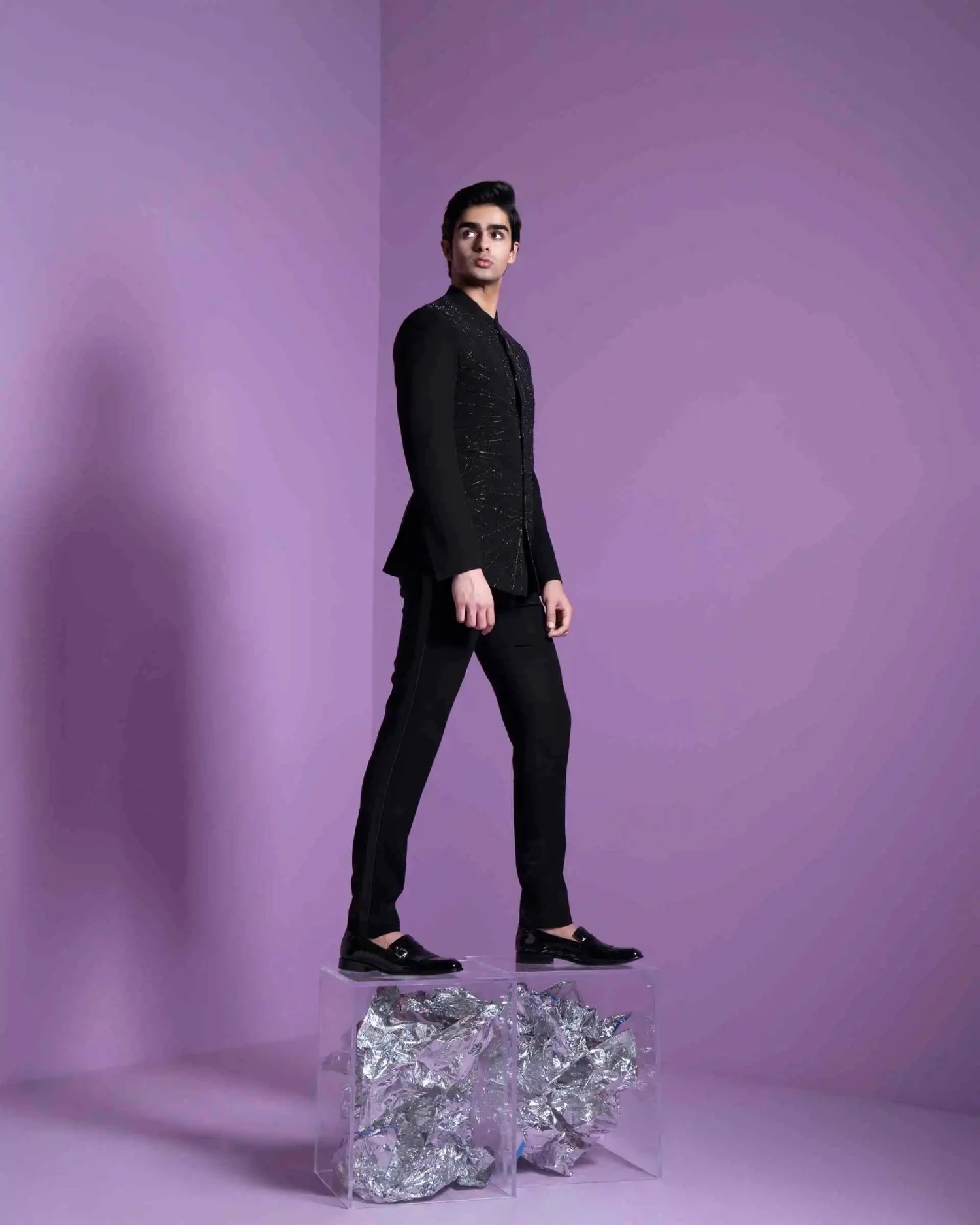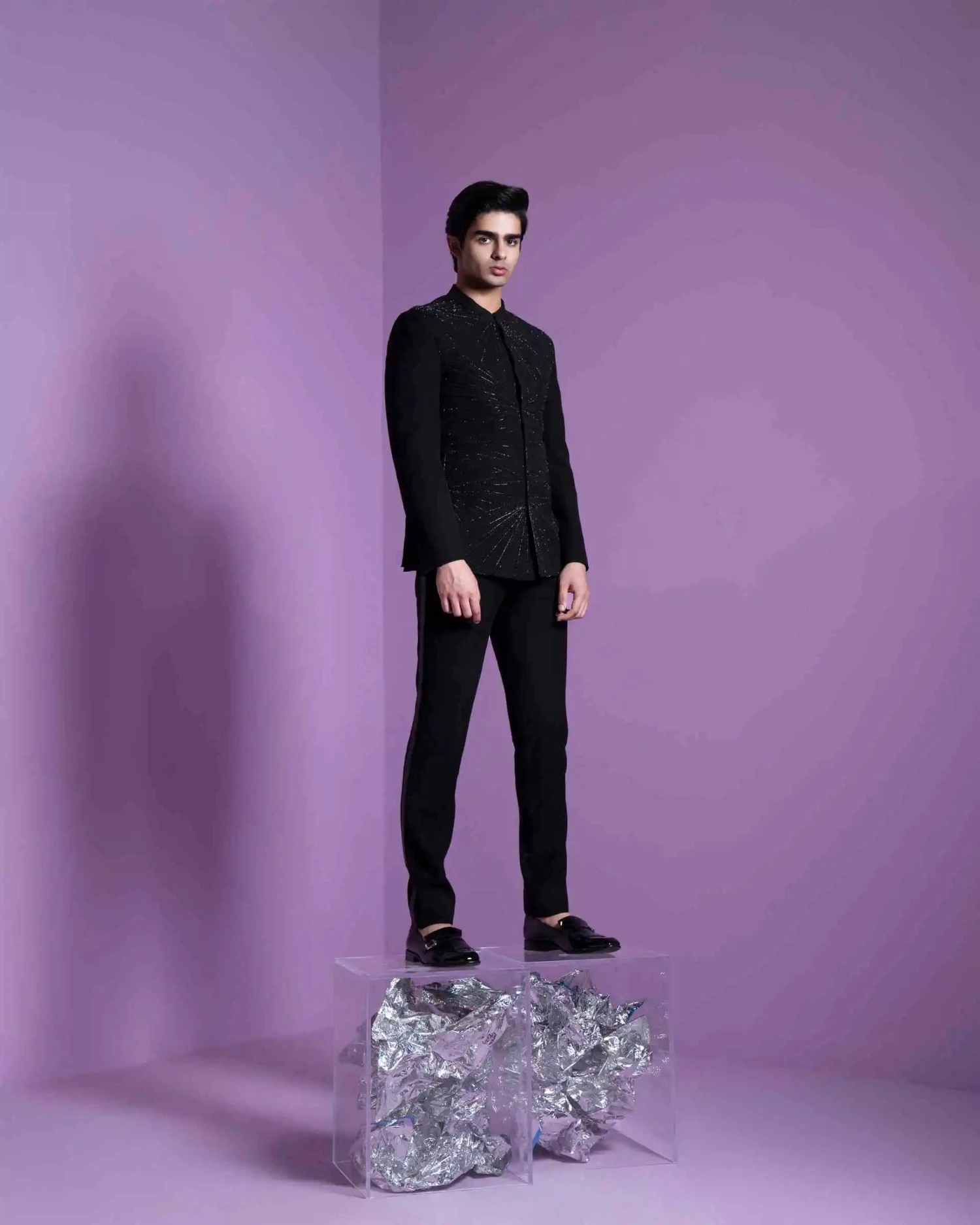 Monochromatic geometric embroidered pattern bandgala embroidered with crystal , cutdana and zari work. Paired with tux sash