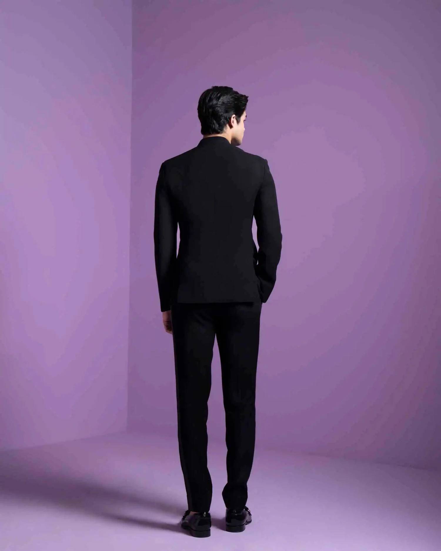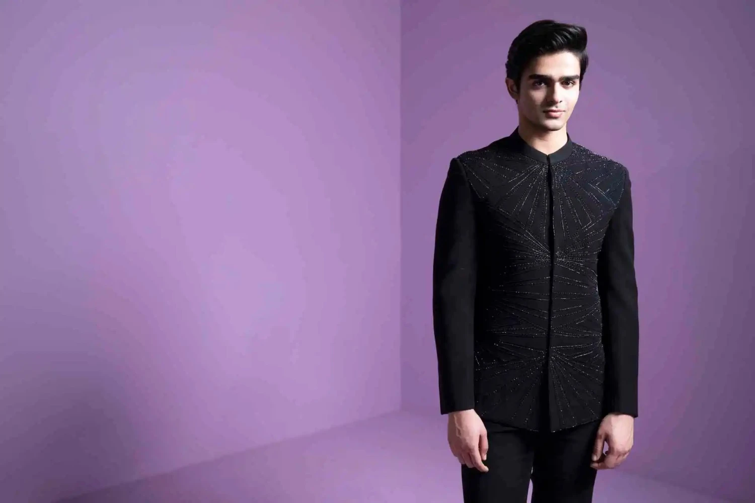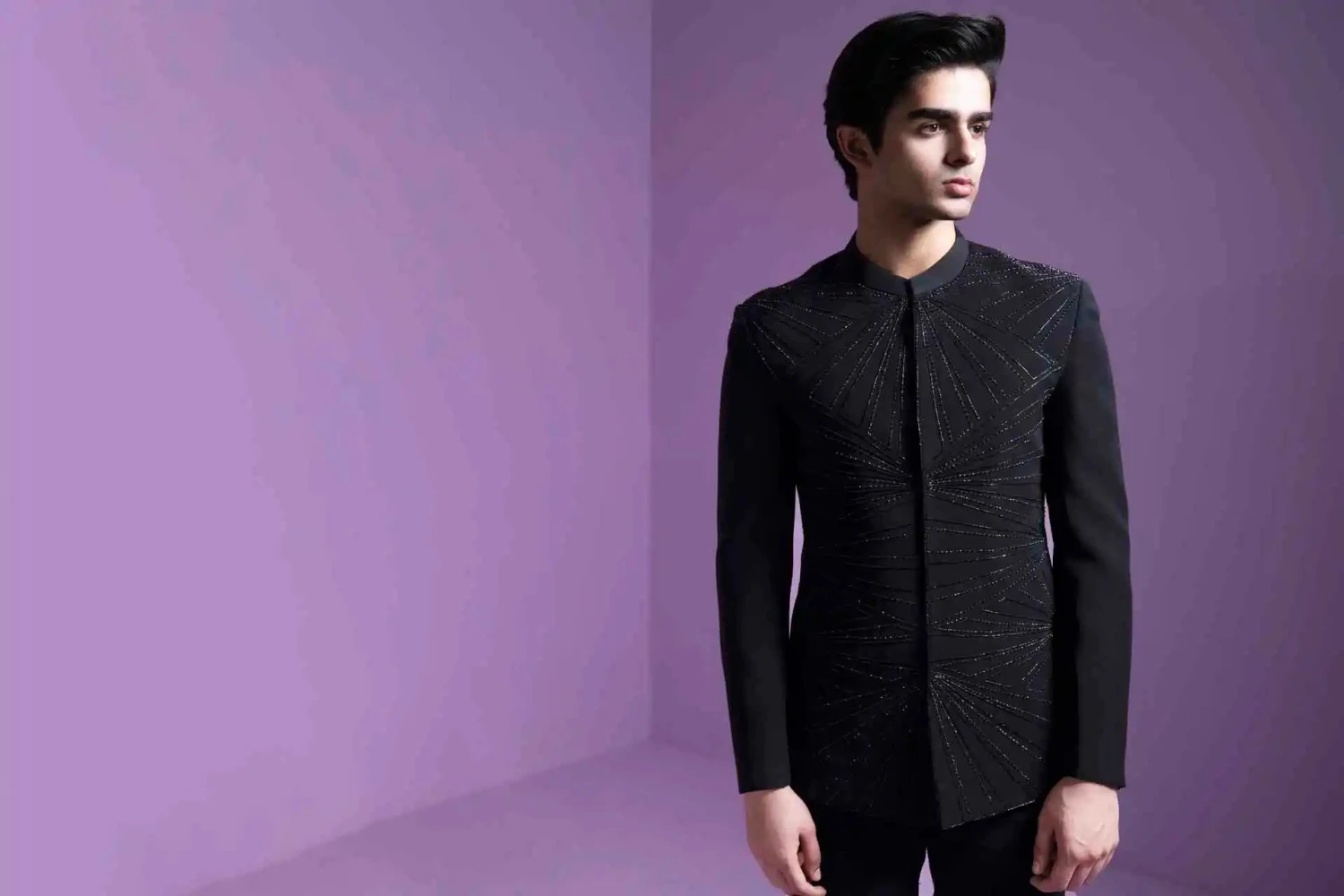 Monochromatic geometric embroidered pattern bandgala embroidered with crystal , cutdana and zari work. Paired with tux sash