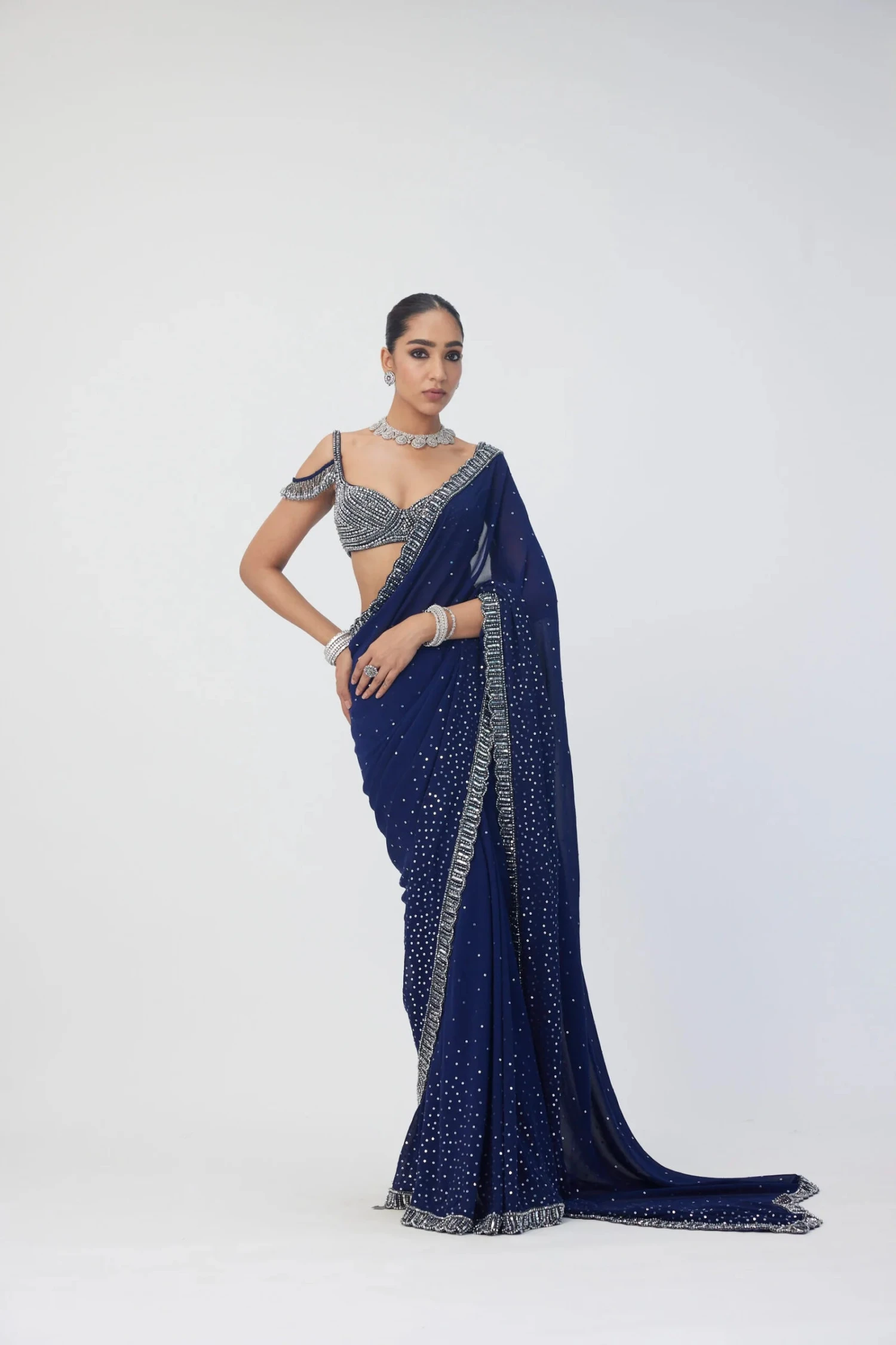 Intricately Hand Embroidered Satin Saree featuring sequins and crystal embroidery clubbed With sleeveless jewelled blouse with crystal embellishments.