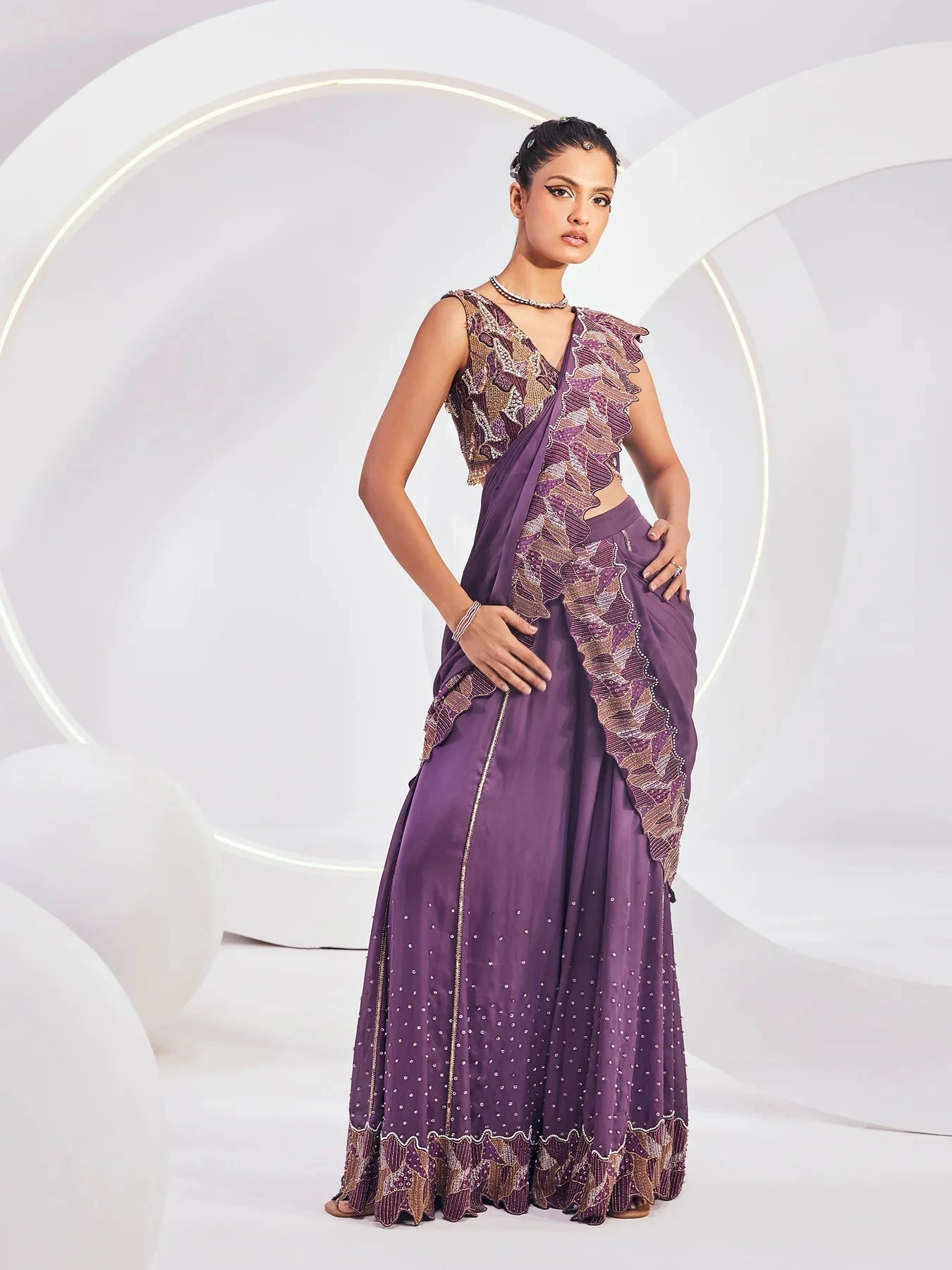 Radiating sophistication with its unique designs, the DELORA Sharara Saree Set is an eclectic look exuding one-of-a-kind simplicity. With its rich embroidery and patterns, the set is a pair of stunning sharara saree and a printed blouse.
