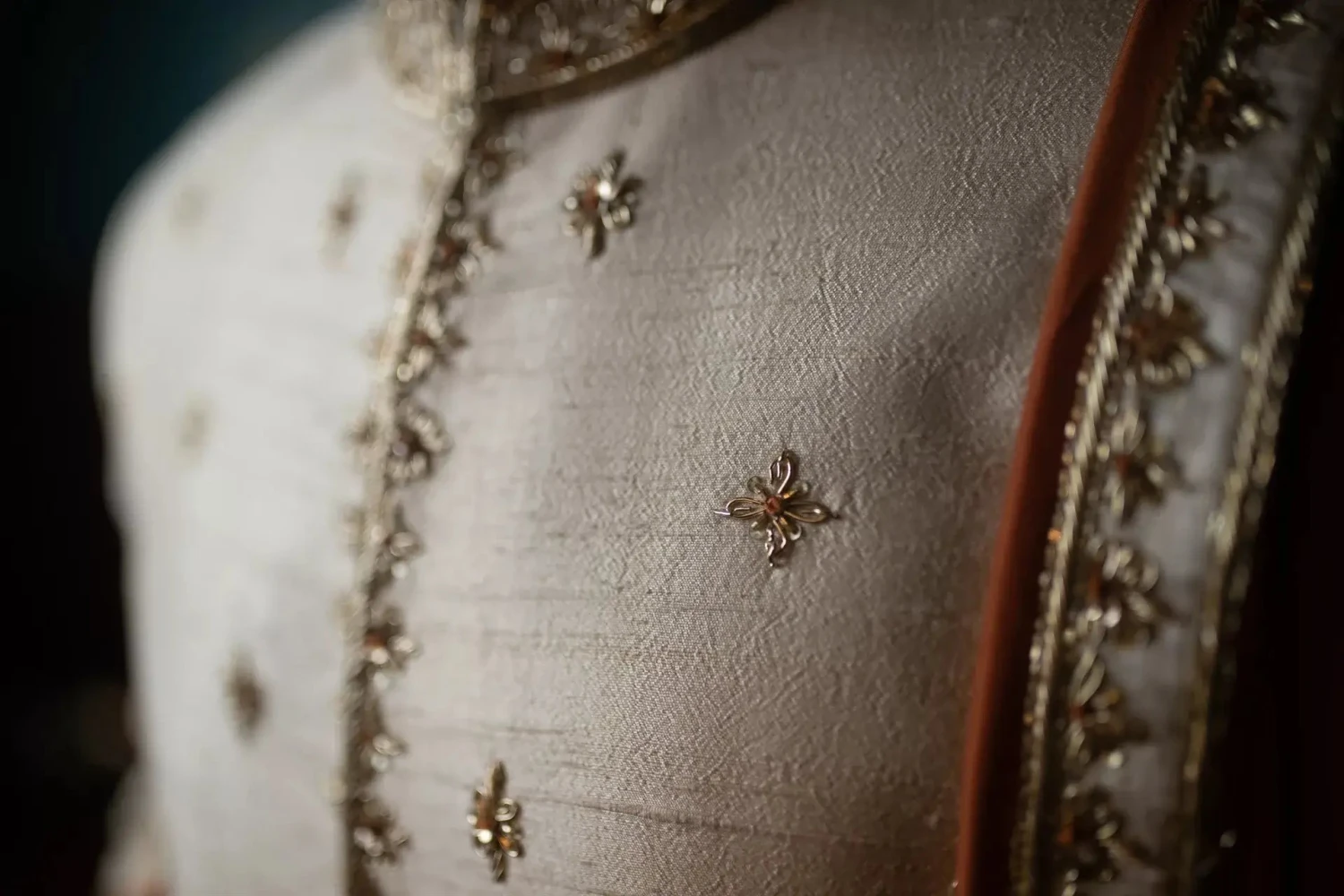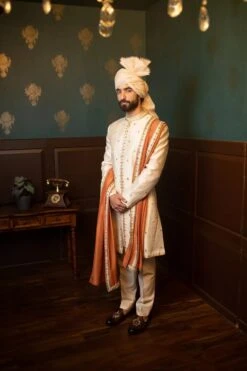 A regal beige sherwani paired with rust stole,all hand embellished with resham and dubka. Comes with with a kurta,pants and safa