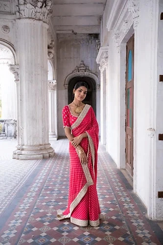 This look features a raspberry pink benarasi saree set. The flowy georgette has woven gold motifs with handcrafted sequin, mirror and pearl border. A matching embellished scoop neck blouse completes the look.